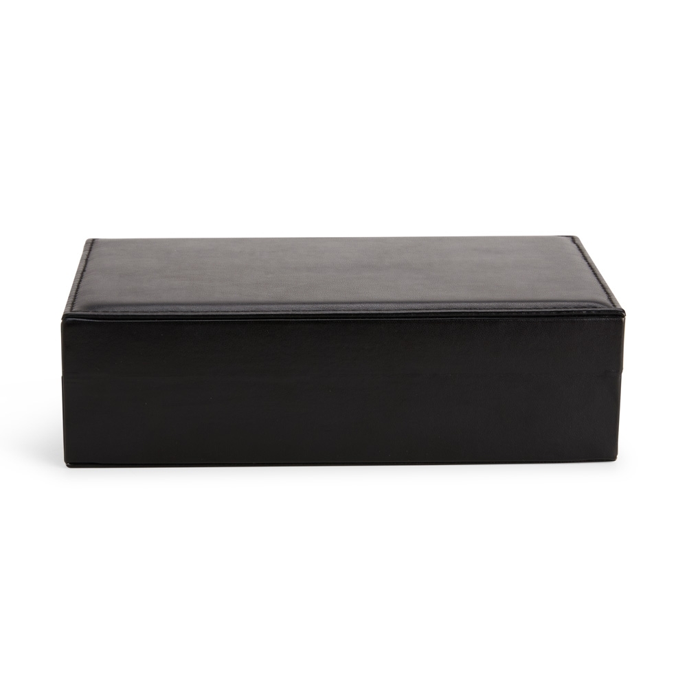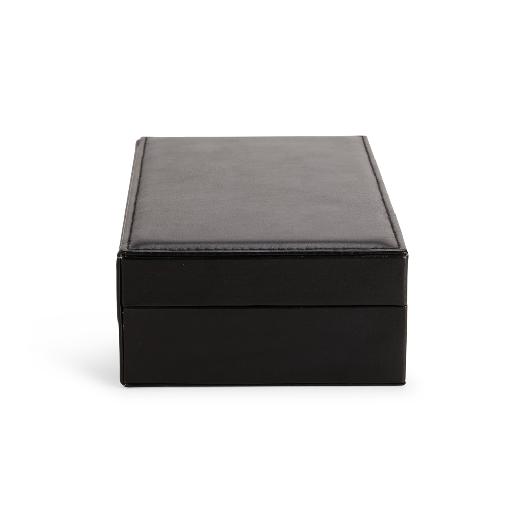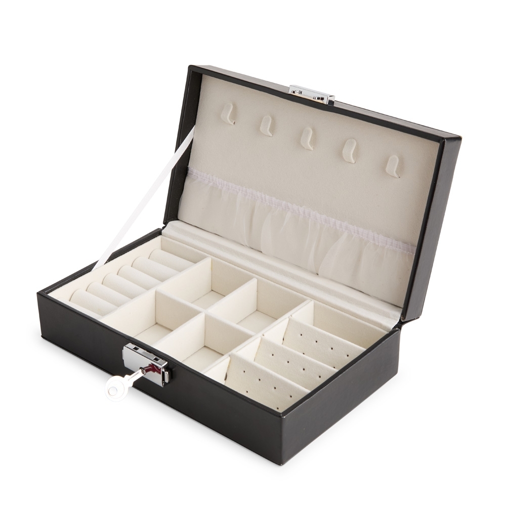 Porta-joias em couro sintético liso, com revestimento interno em veludo e trava de segurança para o fechamento. Apresenta cinco ganchos e um bolso em nylon com elástico na parte interna da tampa, além de nove divisórias em diferentes tamanhos espalhadas pelo compartimento principal, uma delas com almofadas para abrigar anéis e brincos. Acompanha chave para abertura e fechamento do estojo.