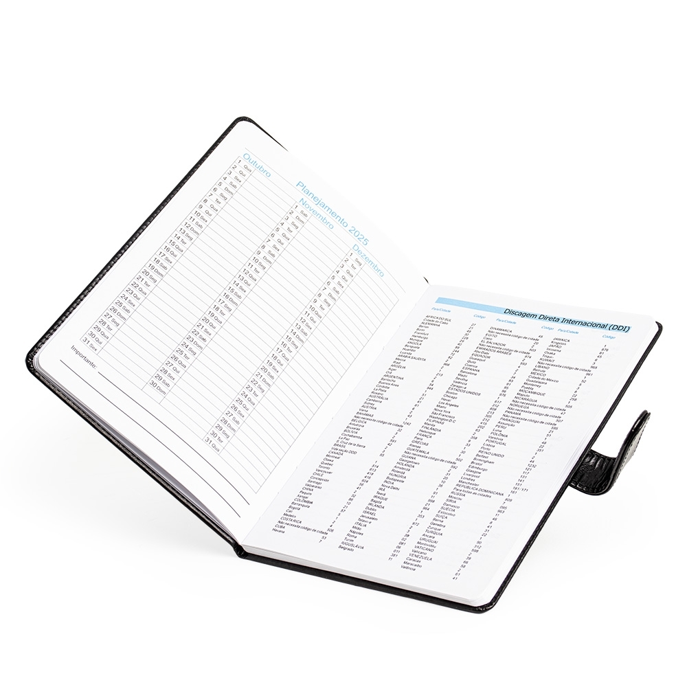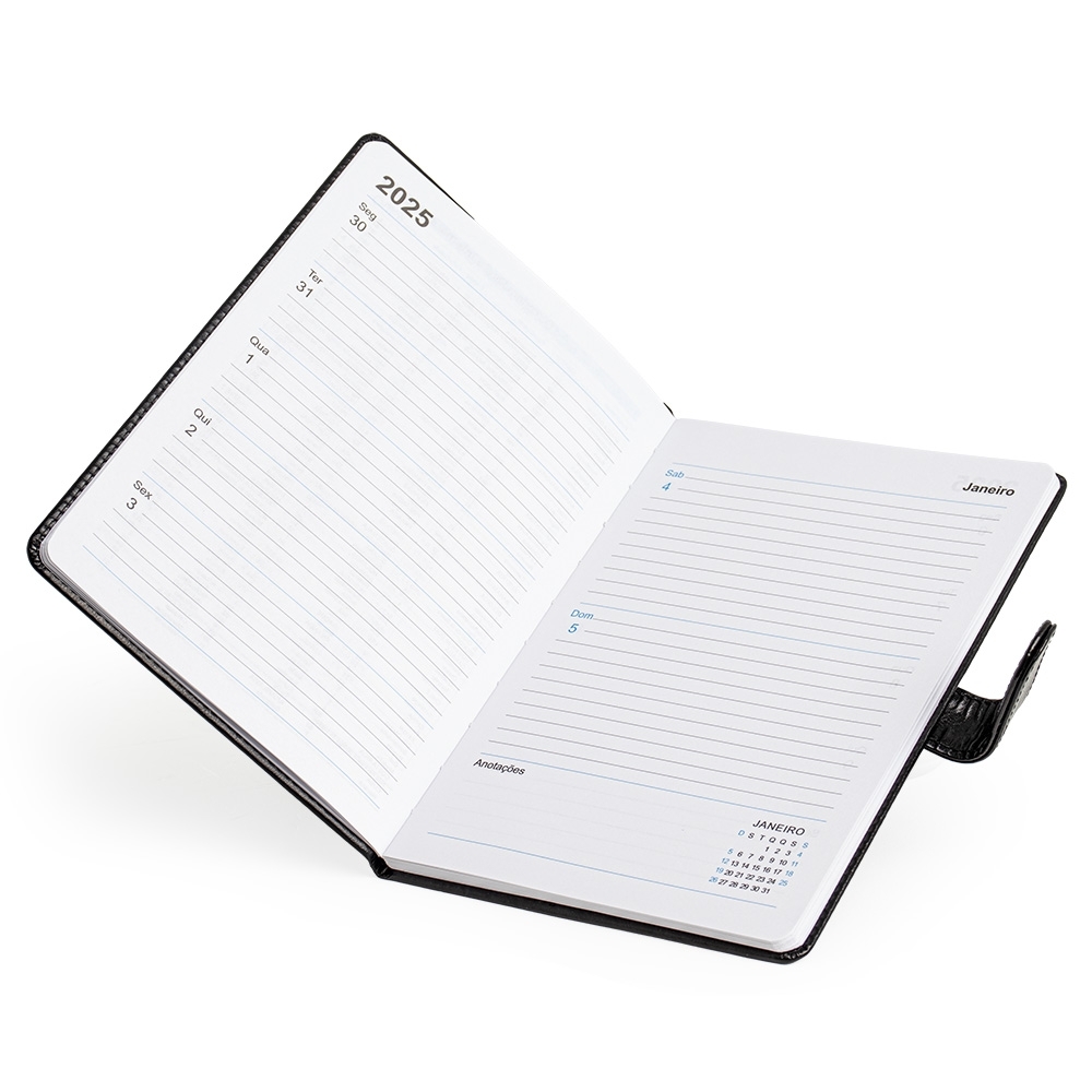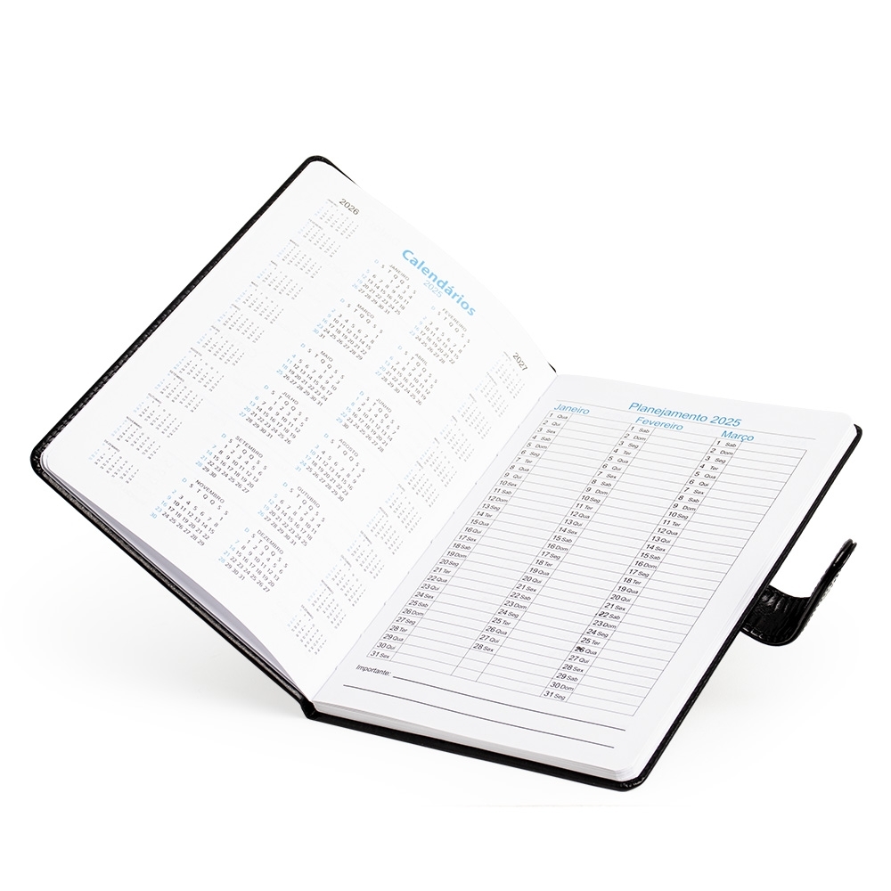 Agenda semanal 2025 produzida em couro PU com fecho magnético. Contém folhas para dados pessoais, calendários 2025 à 2027 e planejamento 2025.