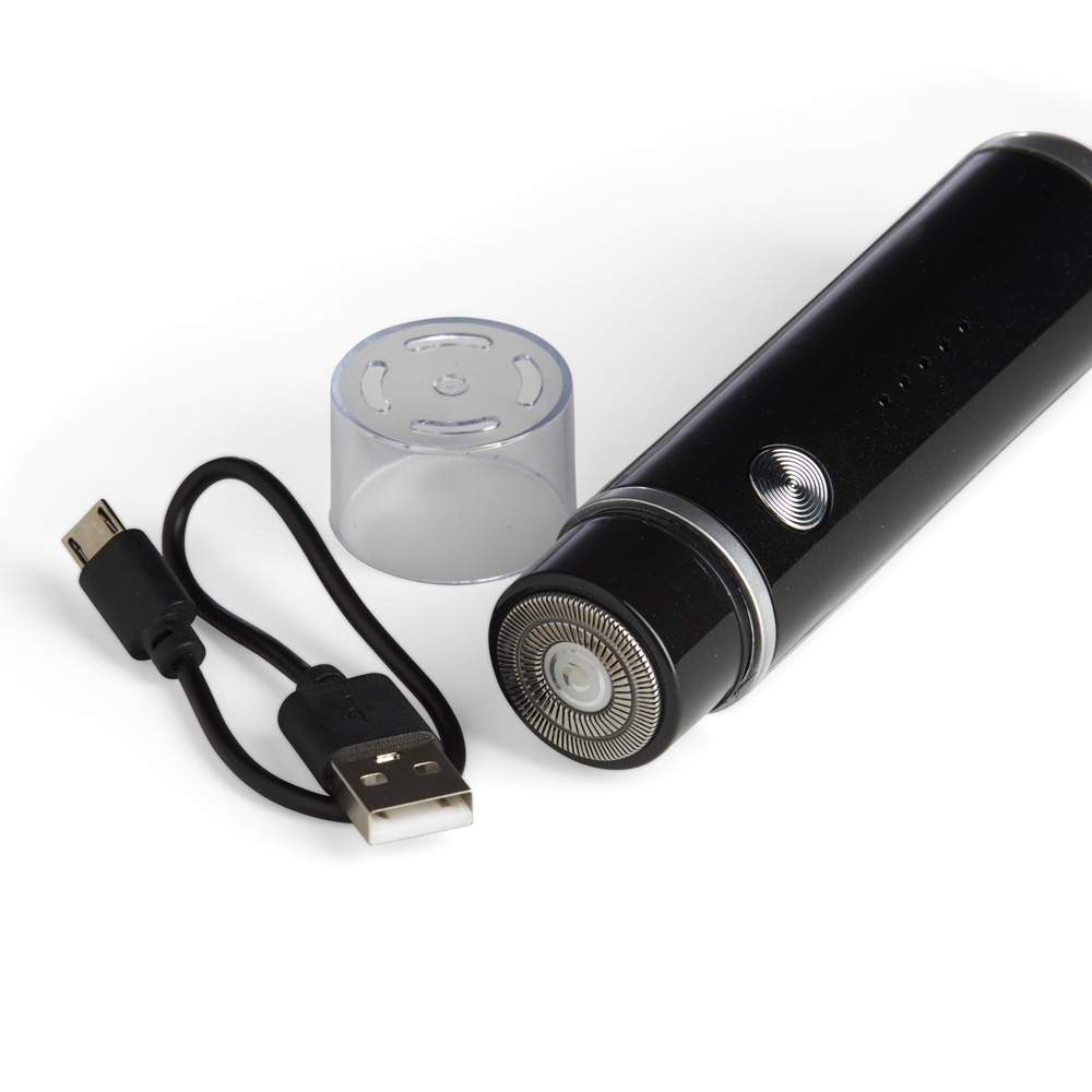 Aparador de barba elétrico recarregável. Possui status da bateria visível e botão antiderrapante para uma maior aderência ao toque. Acompanha cabo USB Tipo-C, escovinha para limpeza e tampa protetora.