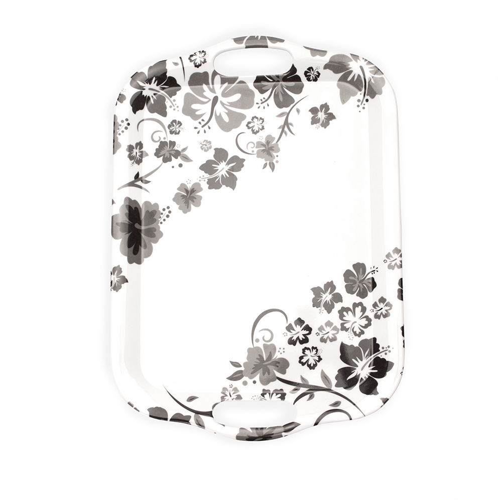 Bandeja retangular em melamina, material leve, resistente a impactos e fácil de limpar. Contém duas alças laterais para transporte.