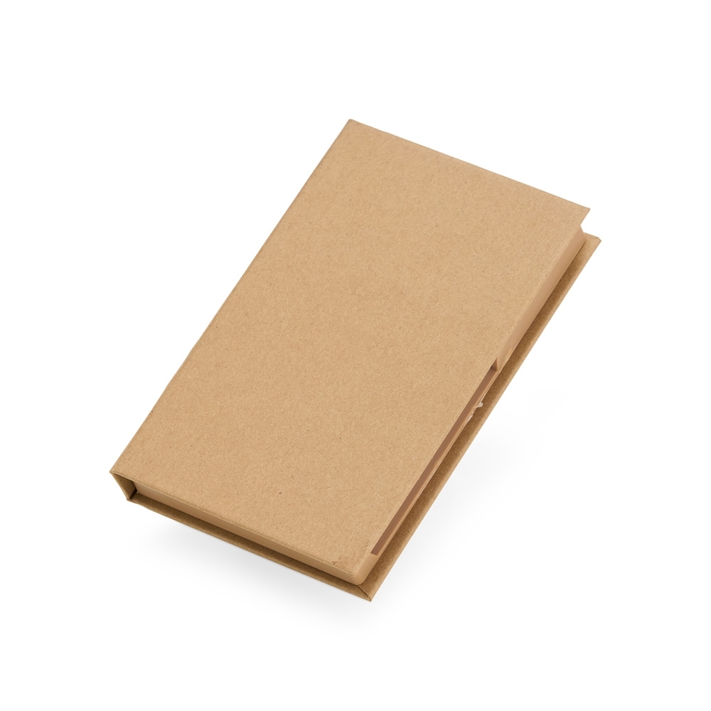 Tudo em seu lugar, prontinho para as anotações! Nosso Bloco de Anotações Ecológico é perfeito para manter a organização enquanto se registra ideias. Feito de material kraft, ele vem com 100 folhas brancas para anotações, 5 marcadores autoadesivos coloridos para destacar o que é importante, 7 clips guardados em uma gavetinha prática e uma mini caneta de papelão com carga esferográfica azul. E ainda conta com espaço para armazenar a caneta e dois suportes porta-caneta, garantindo praticidade no dia a dia. Este bloco é tudo o que o seu cliente precisa para dias repletos de anotações.
