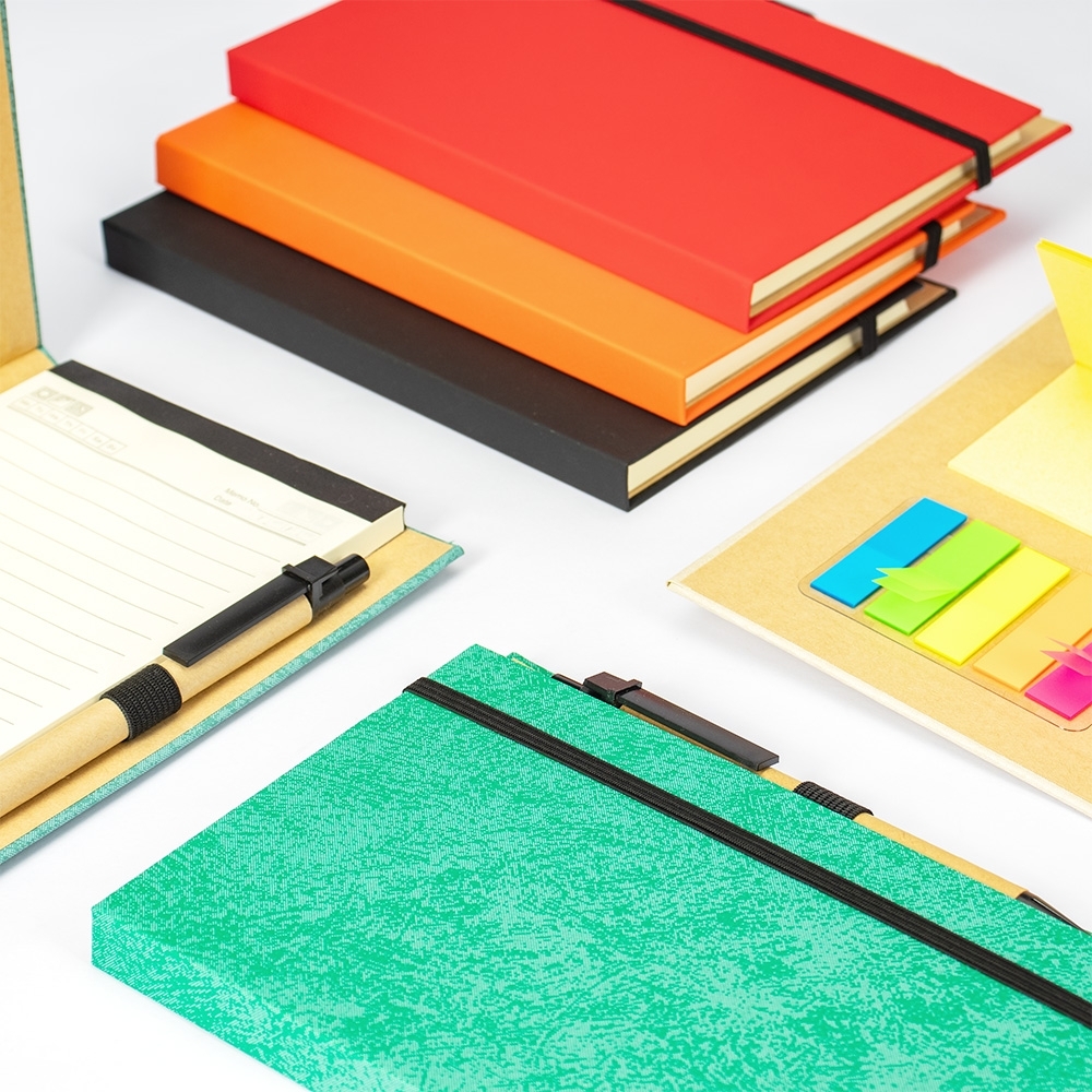 Bloco de anotações com capa dura revestida em papel especial e fita elástica para fechamento. Possui cerca de 80 folhas pautadas, além de um bloco com aproximadamente 20 folhas autoadesivas amarelas e por volta de 100 marcadores de página autoadesivos, divididos em cinco cores diferentes. Acompanha uma caneta esferográfica com carga azul de 1.0mm e acionamento por clique, corpo em papelão e demais componentes em plástico.