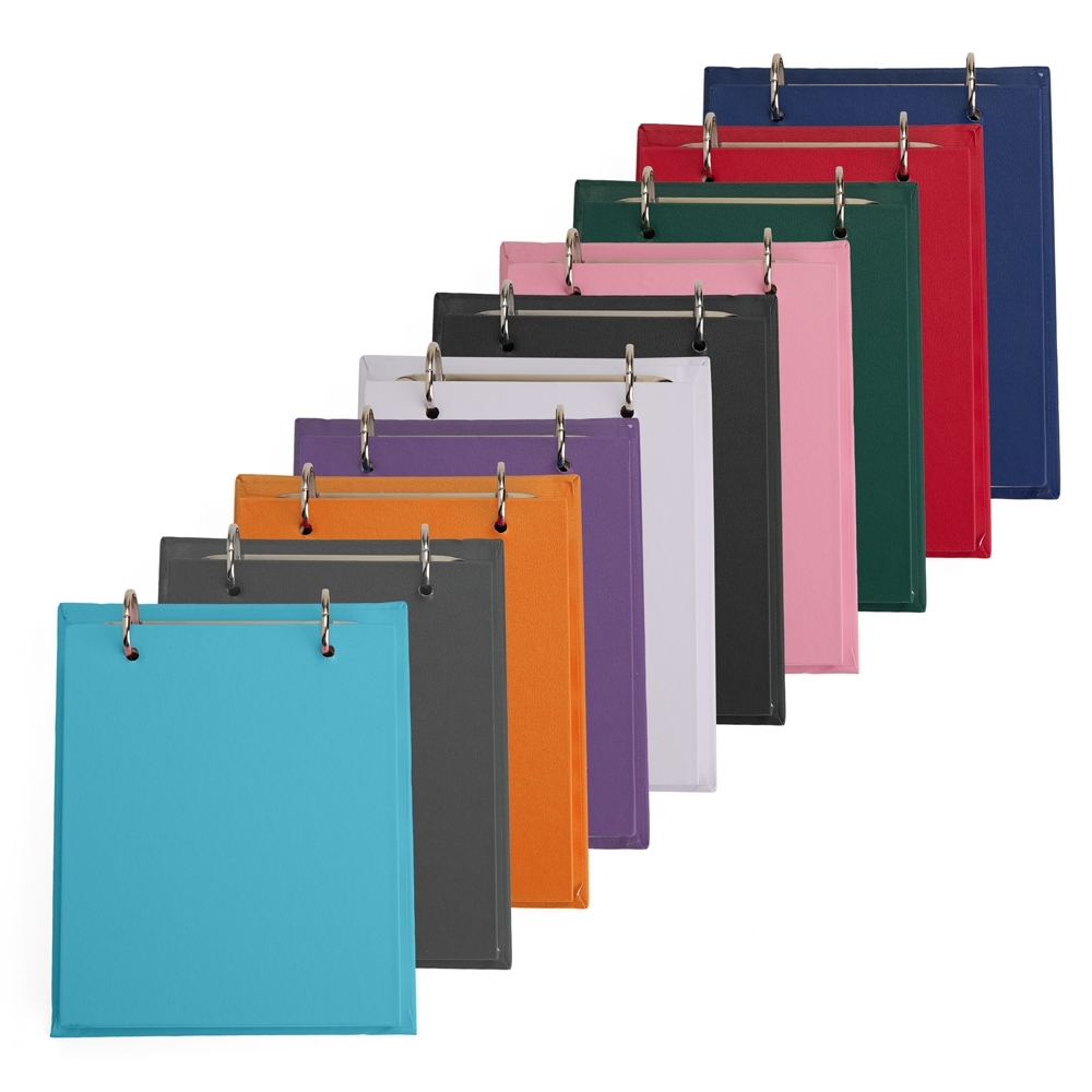 Bloco de anotações de mesa com trilho de ferro e capa dura em percalux. Possui aproximadamente 150 folhas brancas sem pauta com área destacável.