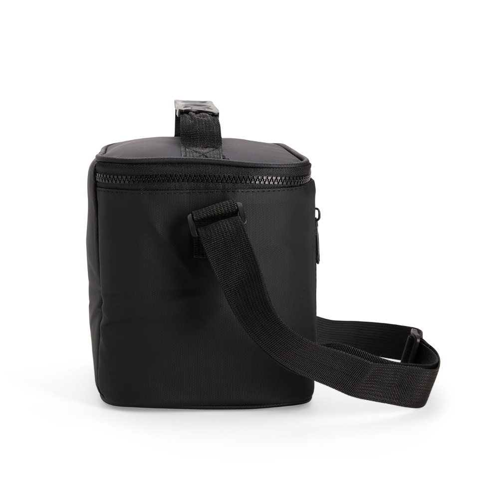 Bolsa térmica confeccionada em poliéster mesclado com PVC impermeável, fechamento por zíper e capacidade máxima de 6 litros. Possui revestimento térmico em PEVA atóxico, o que ajuda a conservar a temperatura de alimentos e bebidas por mais tempo. Conta também com bolso frontal, placa emborrachada para personalização, uma alça de mão e alça transversal.