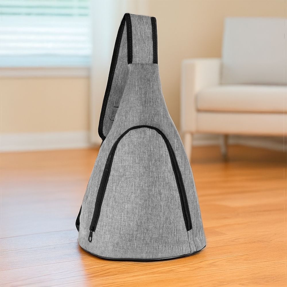 Bolsa transversal em tecido resistente a água, alça ajustável, fechamento em zíper e capacidade máxima de 12 litros.