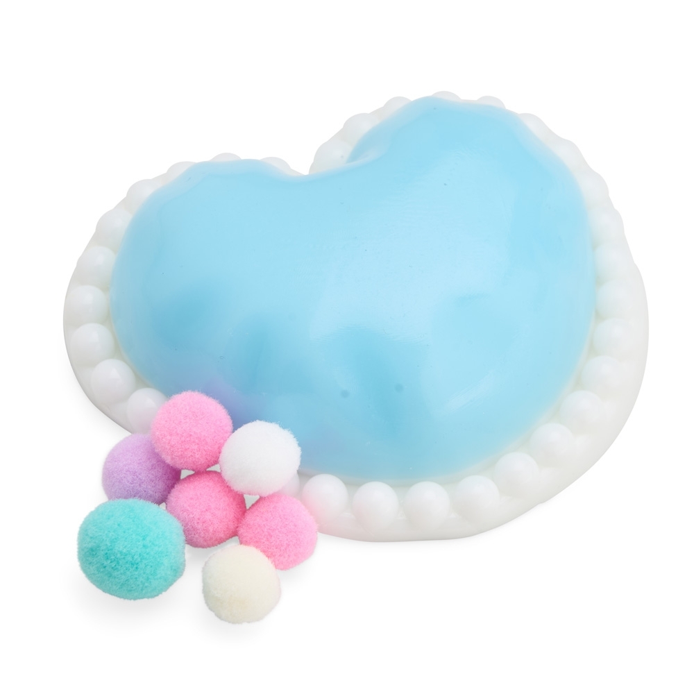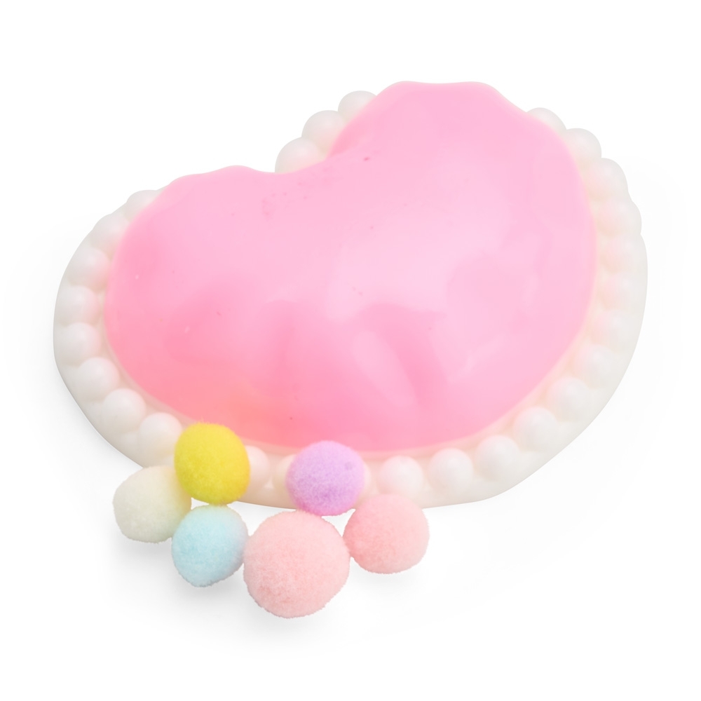 Brinquedo apertável antiestresse em formato de coração. Produzido em borracha termoplástica com superfície lisa e macia, adere facilmente a superfícies planas e acompanha bolinhas de pelúcia para decoração.
