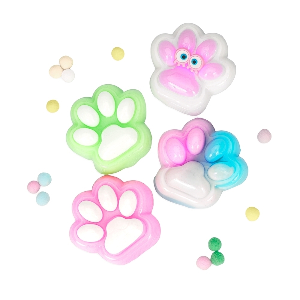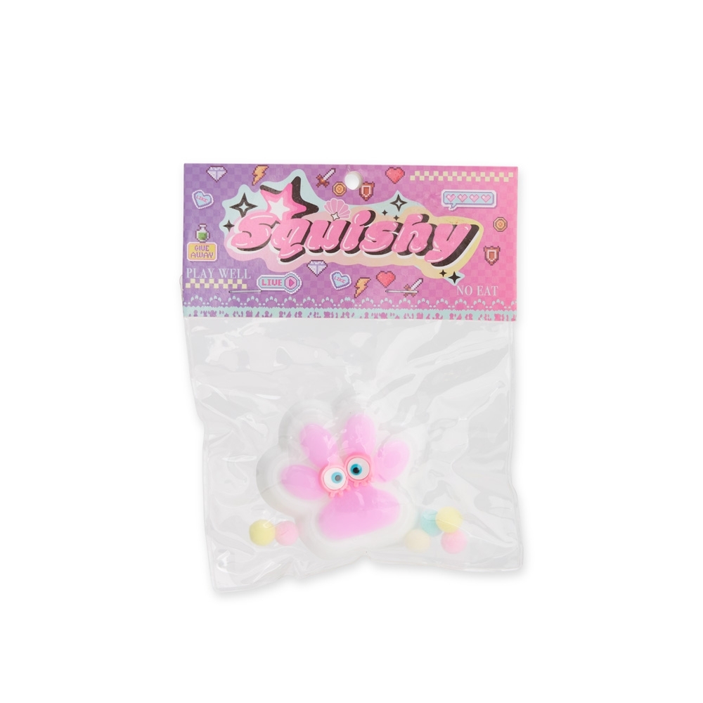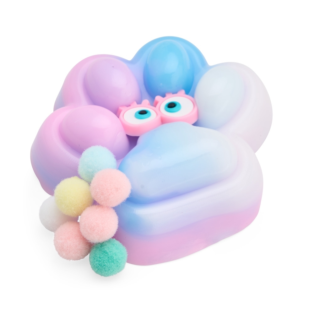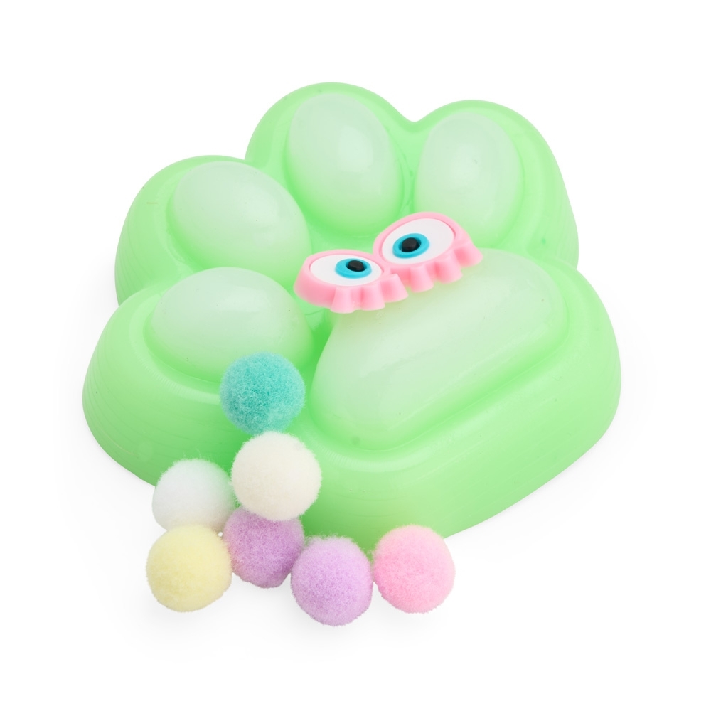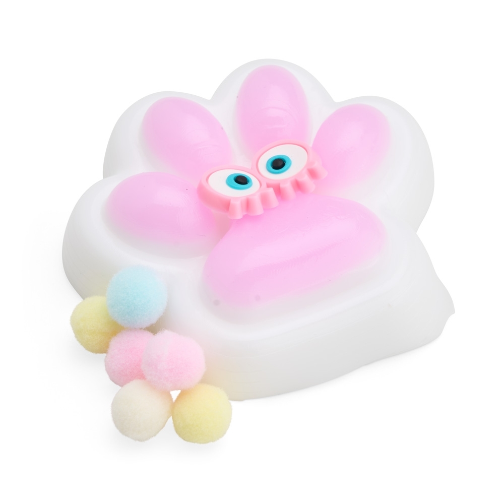Brinquedo apertável antiestresse em formato de pata estilizada. Produzido em borracha termoplástica com superfície lisa e macia, adere facilmente a superfícies planas e acompanha bolinhas de pelúcia para decoração.