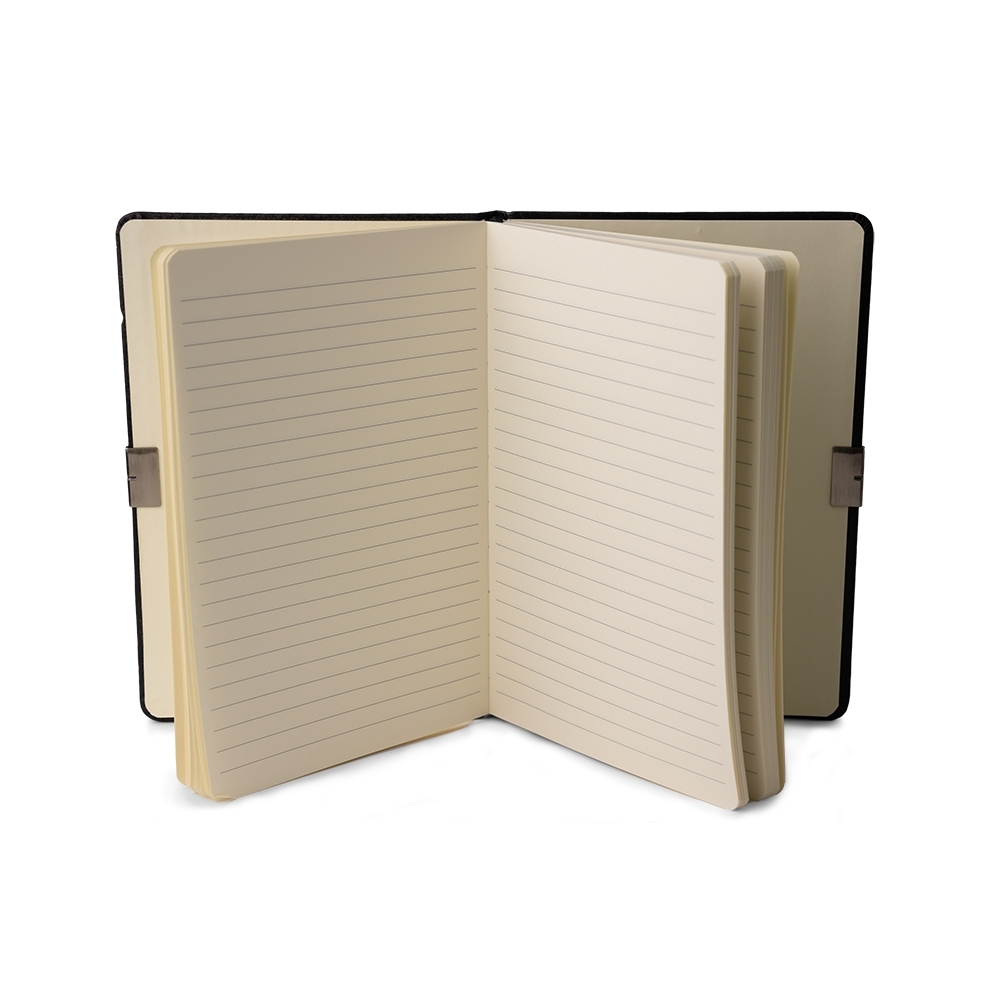Caderneta em couro sintético com detalhe metálico, marcador de página em cetim e fita elástica para fechar. Contém aproximadamente 96 folhas marfim com pauta.