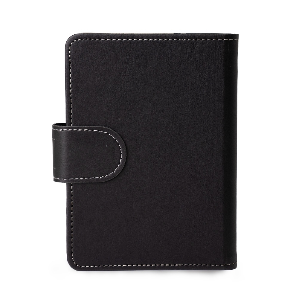 Caderneta de couro sintético com fechamento de botão. Possui caderno capa dura em couro sintético com aproximadamente 100 folhas pautadas, divisórias para cartões e bolso lateral.