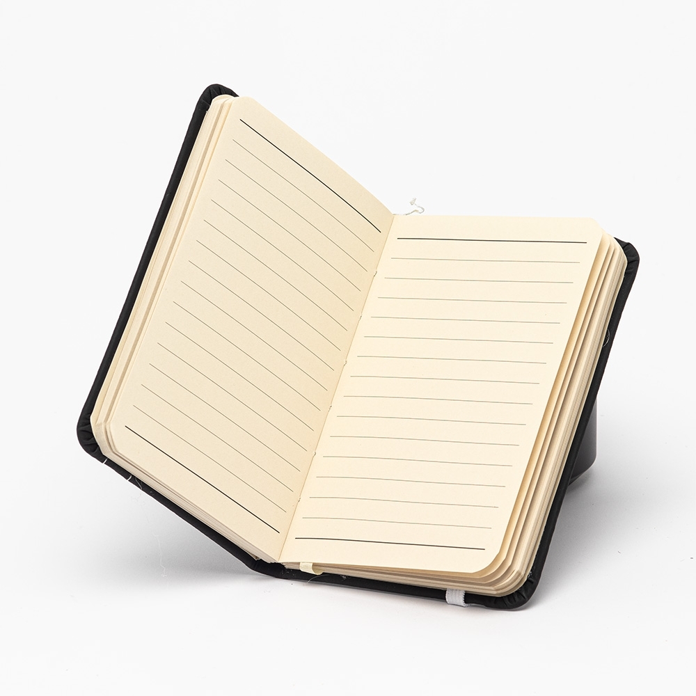 Caderneta emborrachada com marcador de página em cetim e fita elástica de nylon para fechar. Contém aproximadamente 78 folhas marfim pautadas.