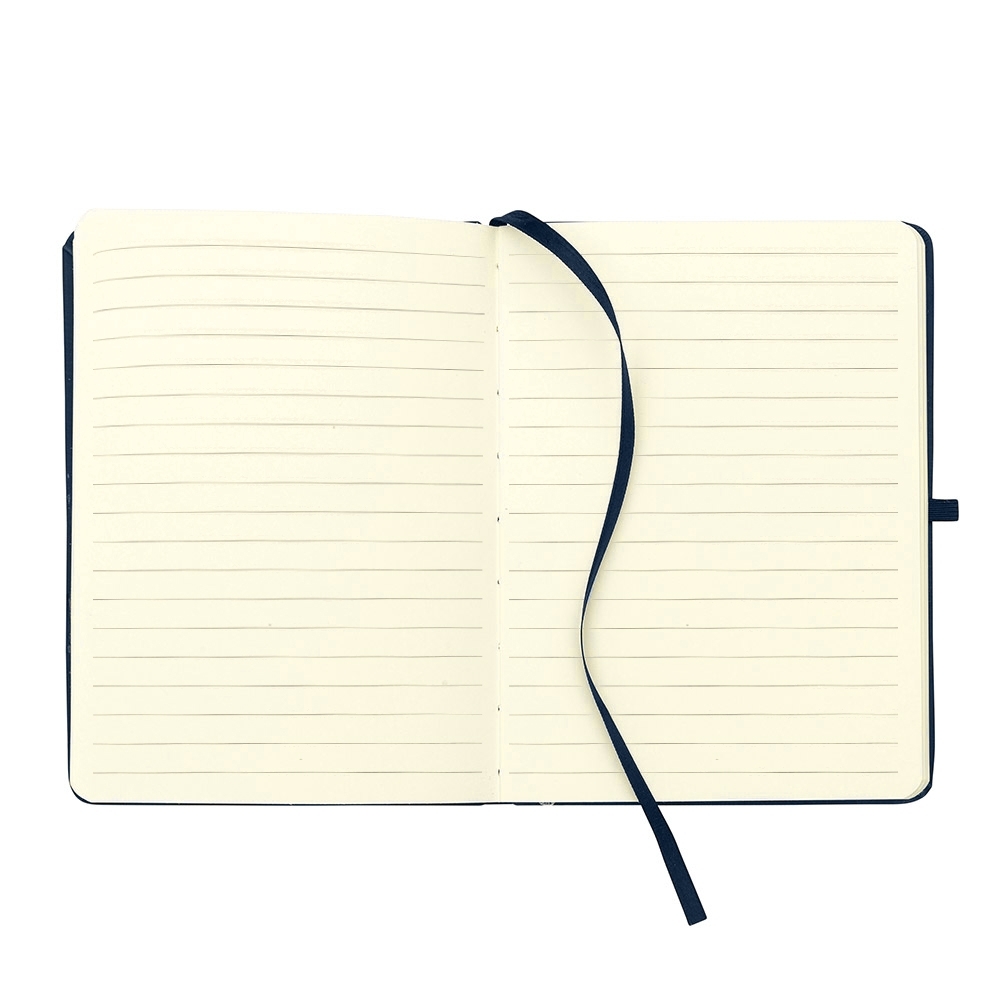 Caderneta emborrachada com porta caneta em nylon, marcador de página em cetim e fita elástica para lacre. Contém aproximadamente 80 folhas pardas com pauta.