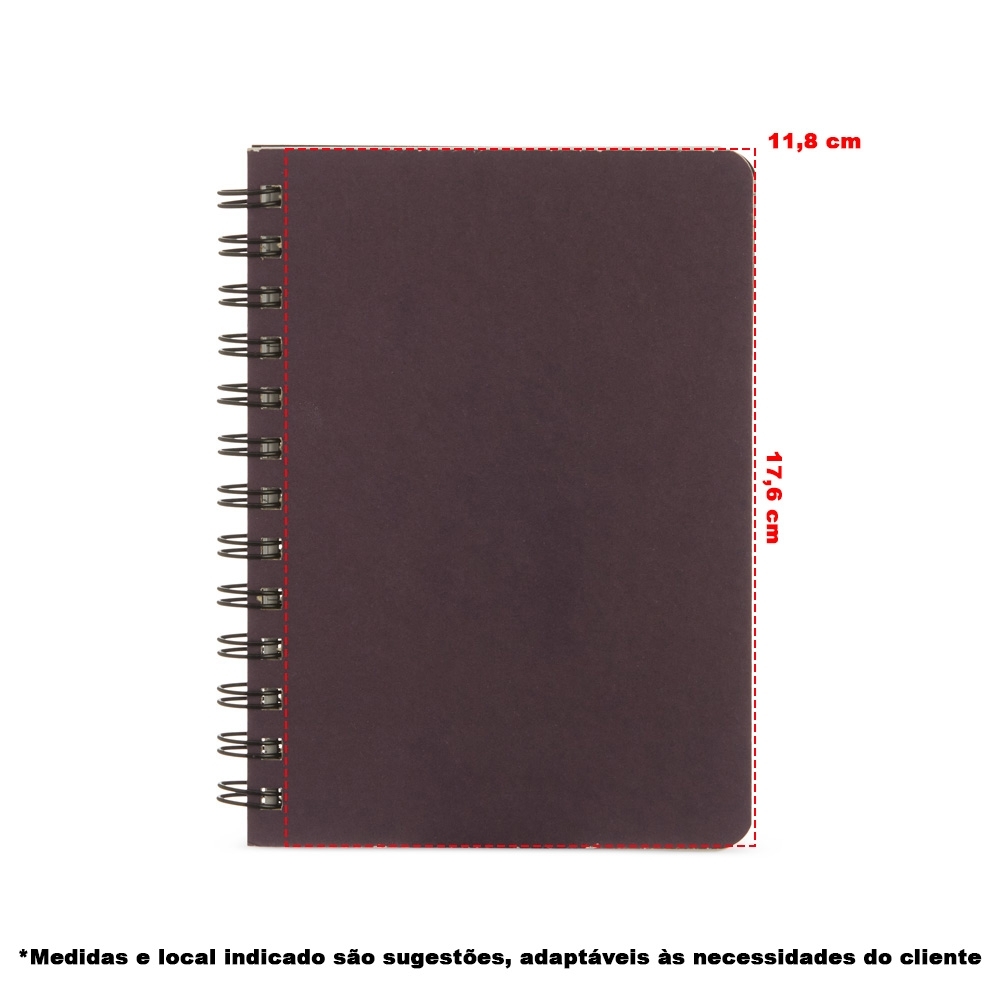 Caderno capa dura em kraft com wire-o. Contém aproximadamente 80 folhas brancas pautadas.