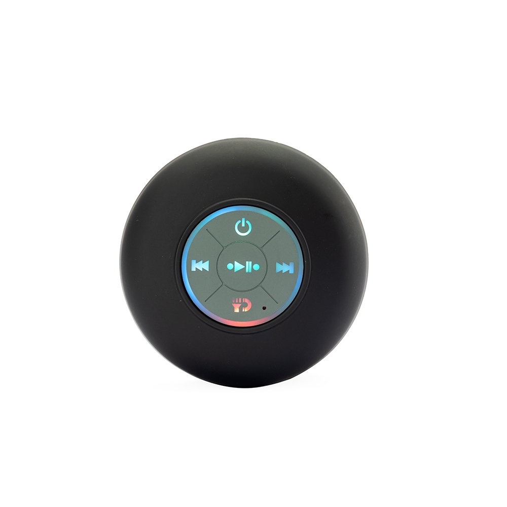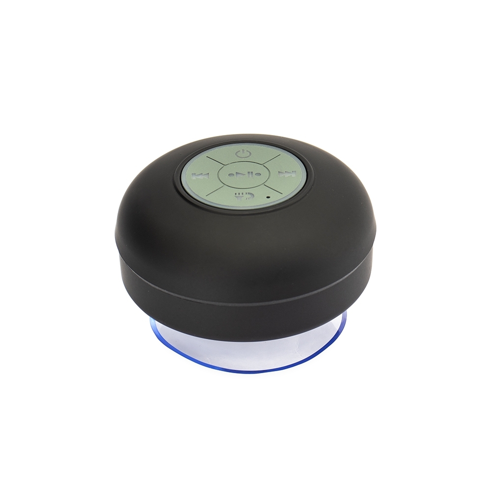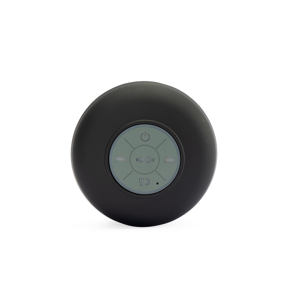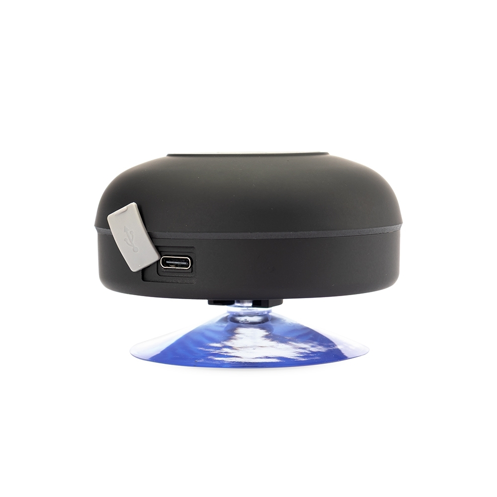Caixa de som multimídia em plástico com textura emborrachada resistente a respingos dágua. Possui conexão Bluetooth e painel com botões de controle de reprodução, além de tecla dedicada ao atendimento de chamadas. Conta ainda com ventosa removível para fixação em superfícies lisas e entrada USB-C para recarga. Acompanha cabo USB-C.