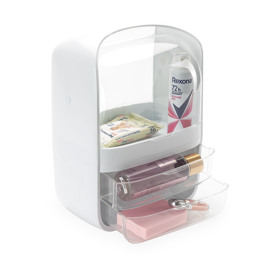 A caixa organizadora para maquiagens e cosméticos é prática e eficiente. Feita em plástico resistente com tampas de acrílico, ela protege os itens contra poeira e umidade, garantindo que tudo fique sempre seguro e preservado. Com um compartimento principal espaçoso e duas gavetas extras, é possível armazenar tudo de forma organizada. Além disso, a alça de transporte facilita levar a caixa para qualquer lugar, transformando qualquer ambiente no espaço perfeito para a rotina de beleza.