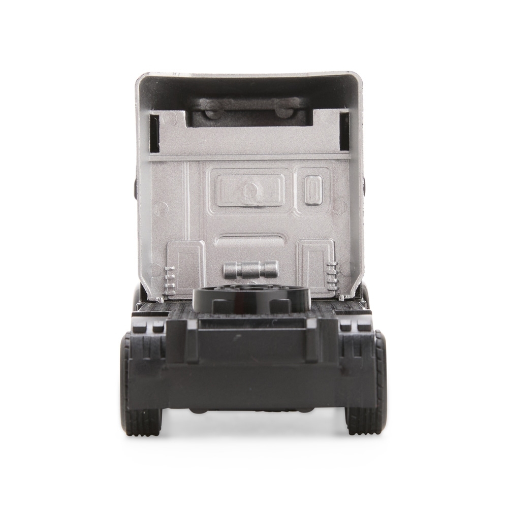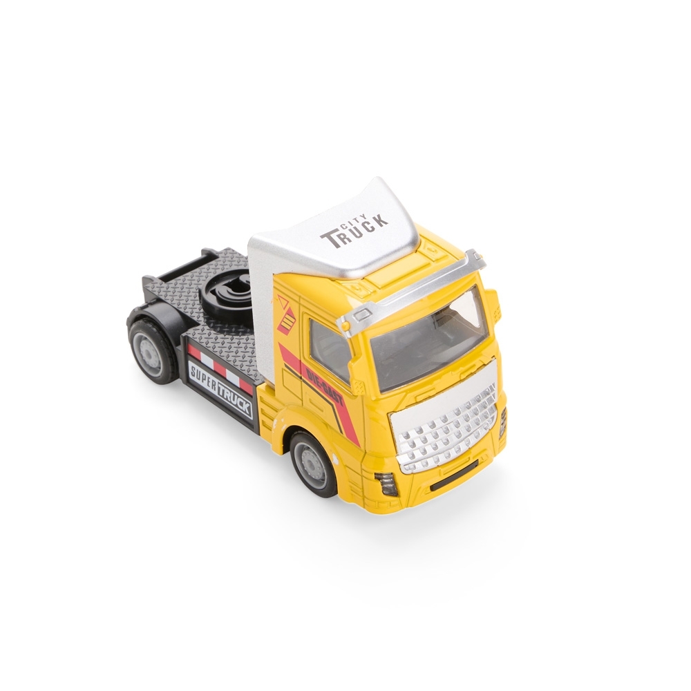 Caminhão em miniatura feito em plástico e metal, com mecanismo de fricção nas rodas dianteiras.