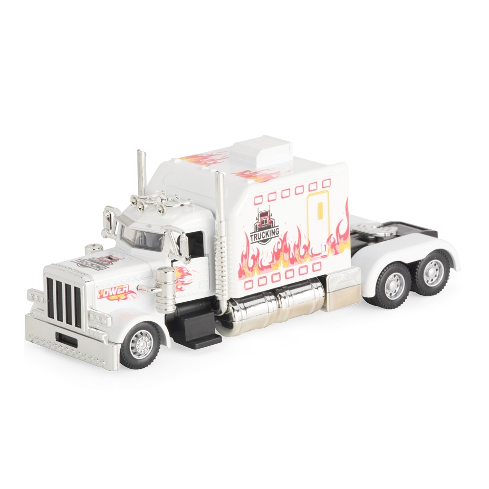 Caminhão em miniatura feito em plástico e metal. Apresenta mecanismo de fricção nas rodas traseiras, portas com fechamento funcional e acabamento detalhado.