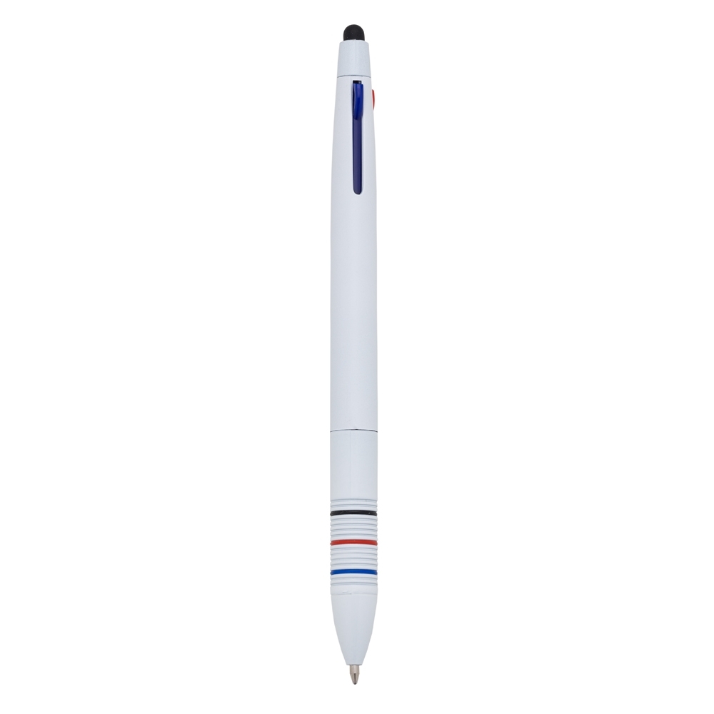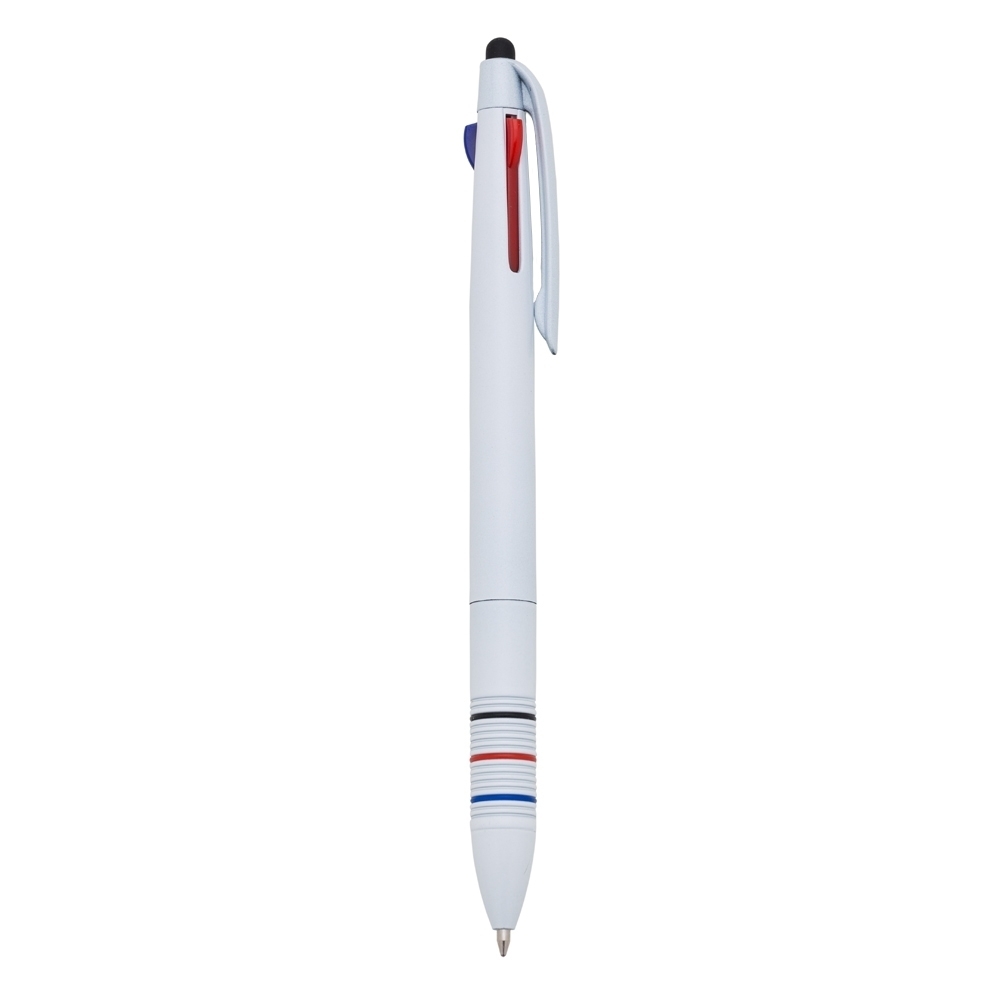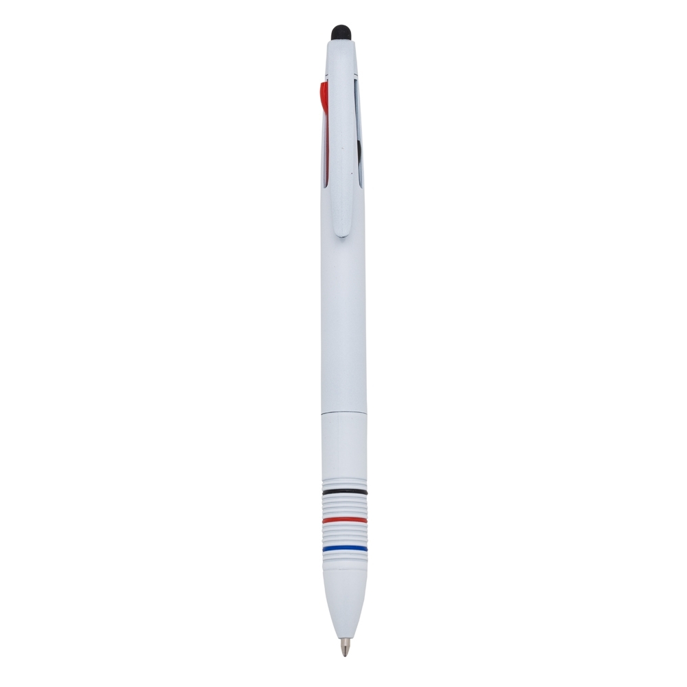 Caneta plástica 3 em 1 com touch screen, cargas esferográficas 1.0 mm nas cores: azul, preto e vermelho.