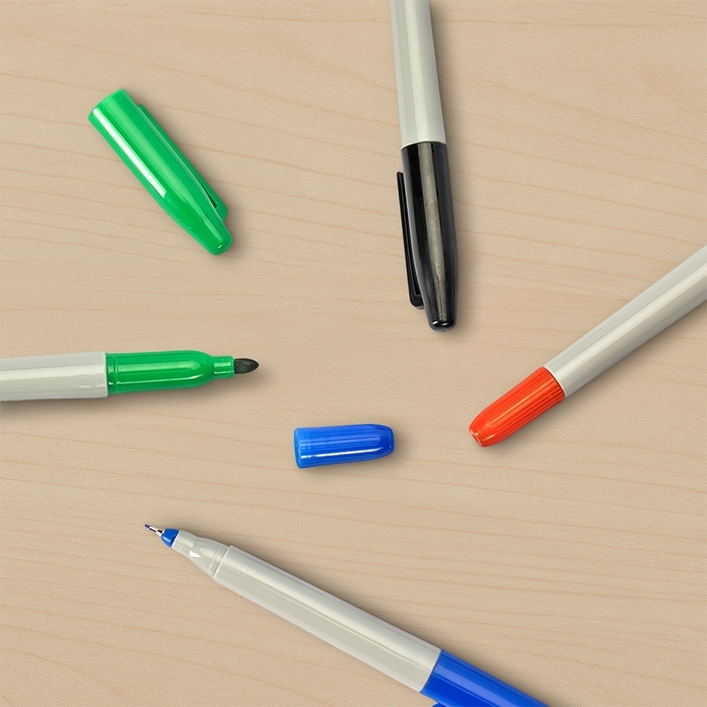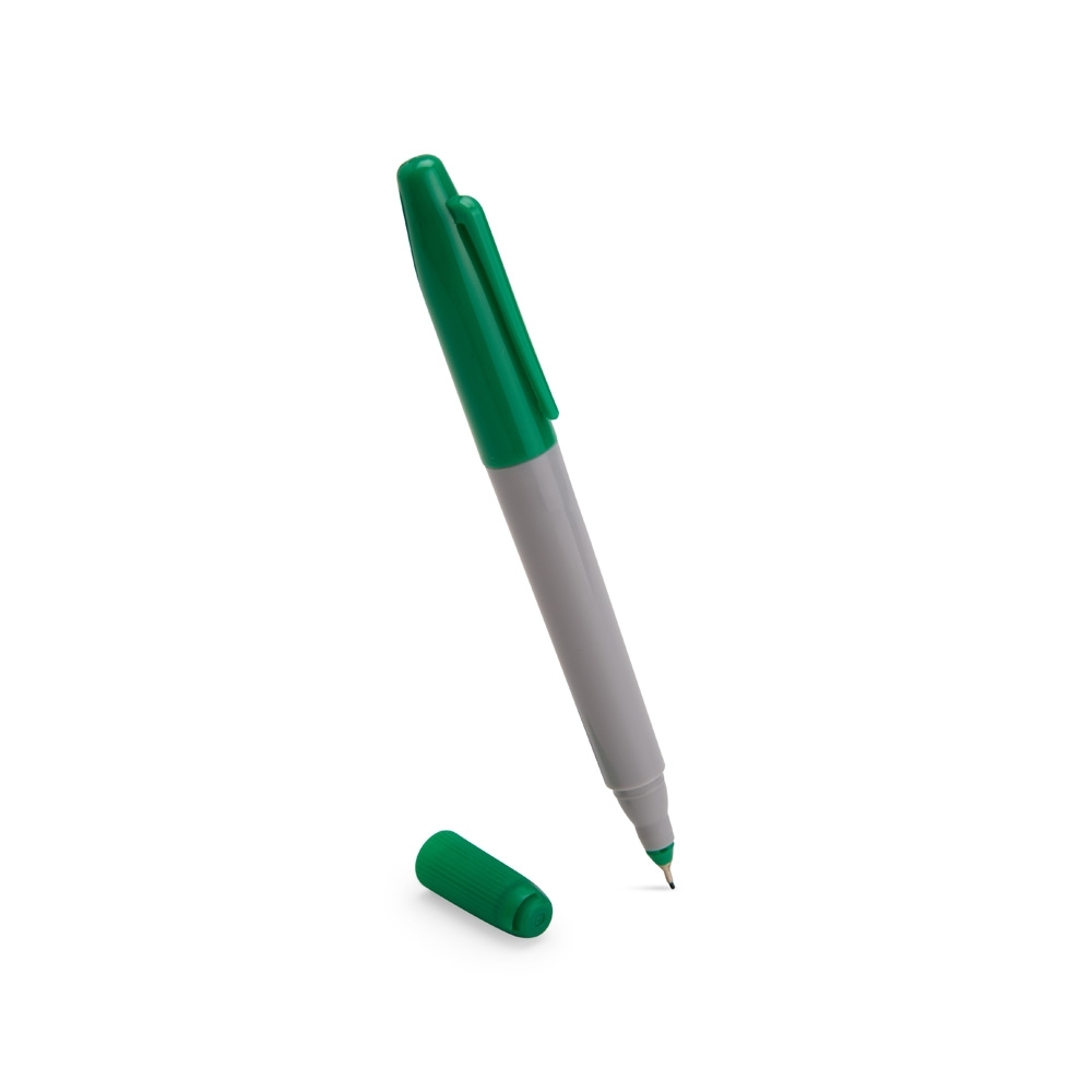 Caneta marcadora plástica com duas pontas em formatos diferentes: uma fina e outra tipo pincel. Possui tinta atóxica à base de óleo com solvente alcoólico.