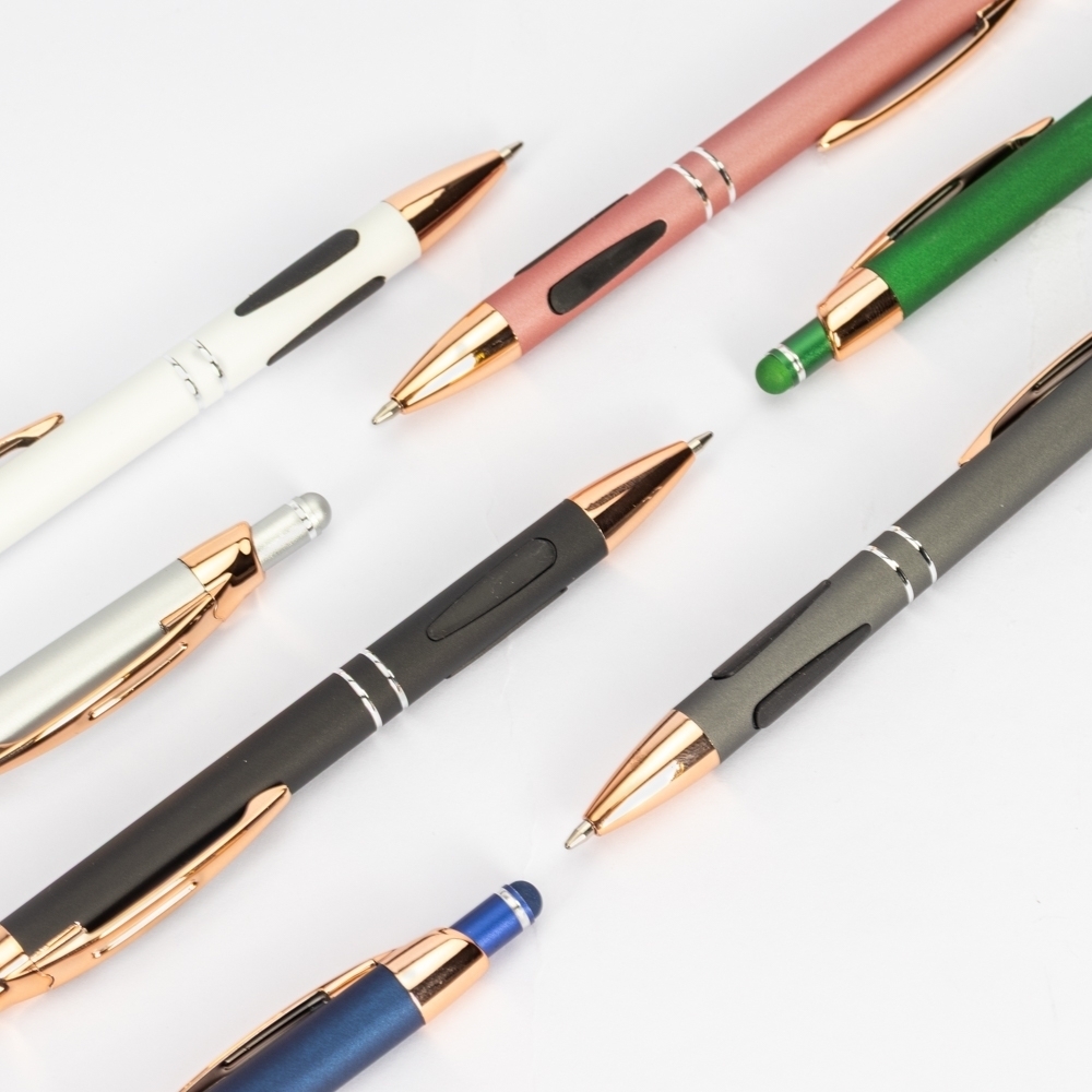 Caneta em metal com detalhes emborrachados, carga esferográfica azul de 1.0mm e acionamento por clique com acabamento emborrachado que permite seu uso como uma caneta touch para interação com dispositivos de tela sensível ao toque.