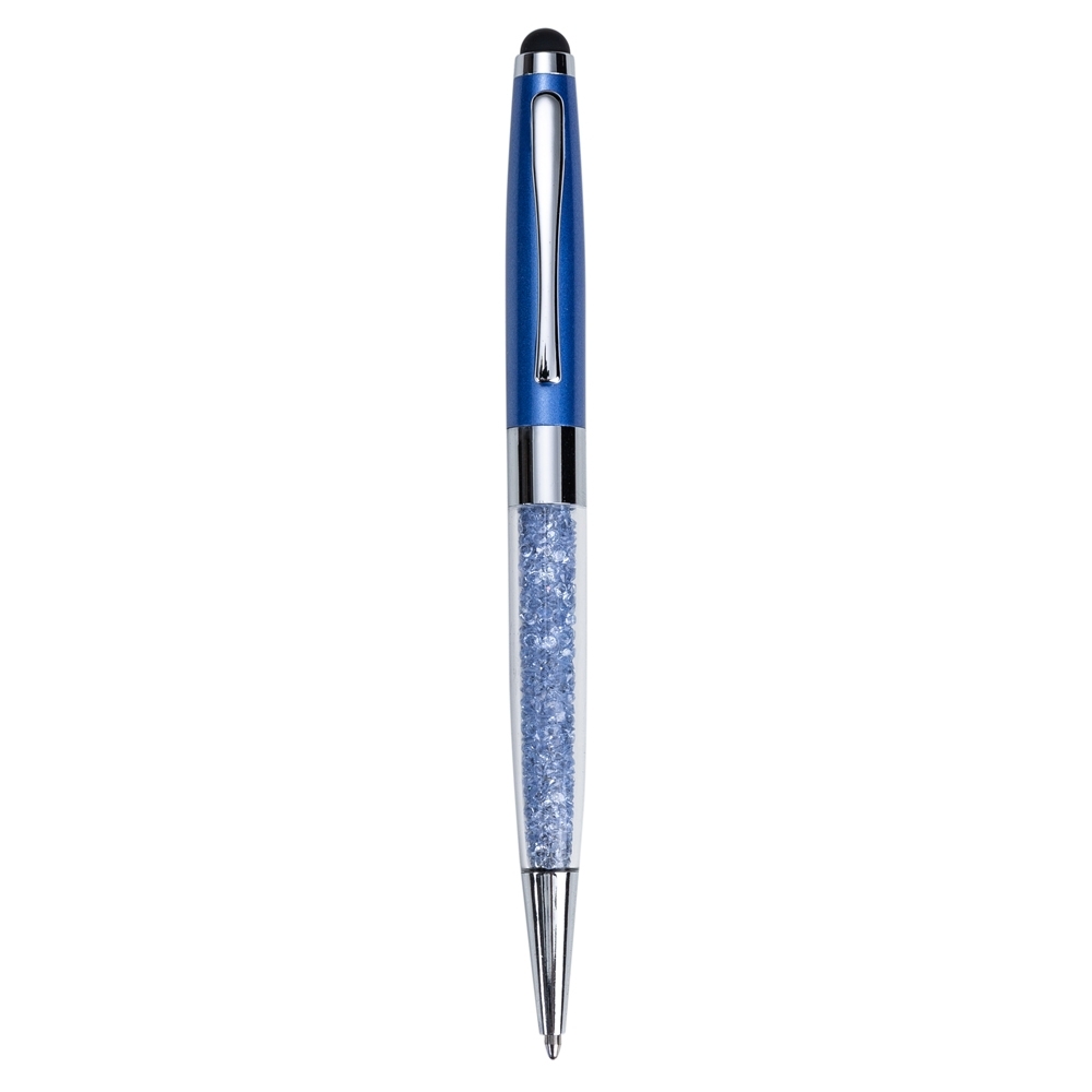 Caneta metálica com touch screen e detalhes em cristal, carga esferográfica azul e acionamento por rotação.