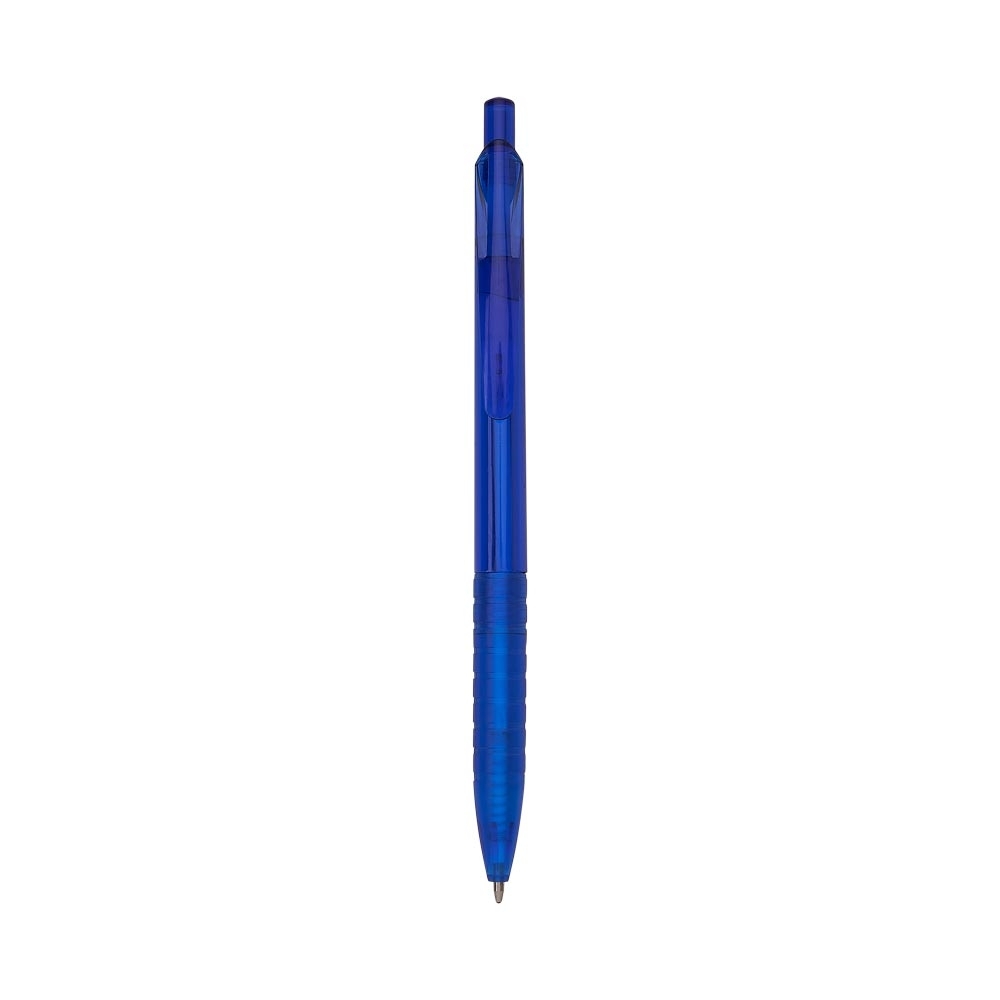 Caneta plástica translúcida com carga esferográfica azul 1.0 mm e acionamento por clique.