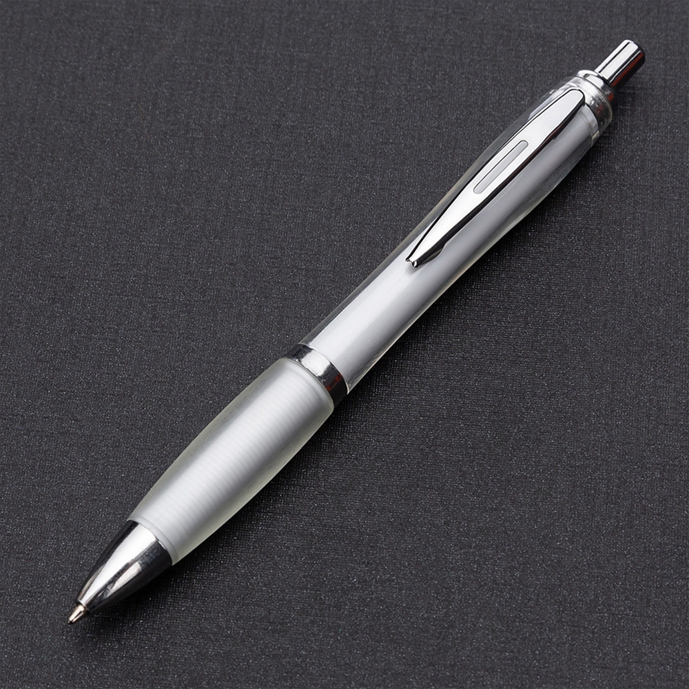 Caneta plástica com detalhe emborrachado, carga esferográfica azul 1.0 mm e acionamento por clique.