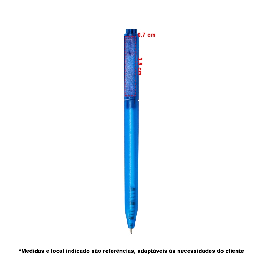 Caneta plástica translúcida com carga esferográfica azul 1mm e acionamento por clique.