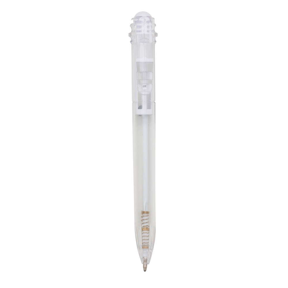 Caneta plástica com carga esferográfica azul e acionamento por clique.