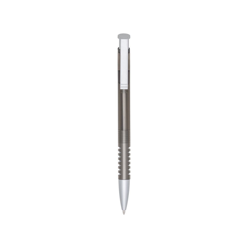 Caneta plástica com carga esferográfica azul 1.0 mm e acionamento por clique.