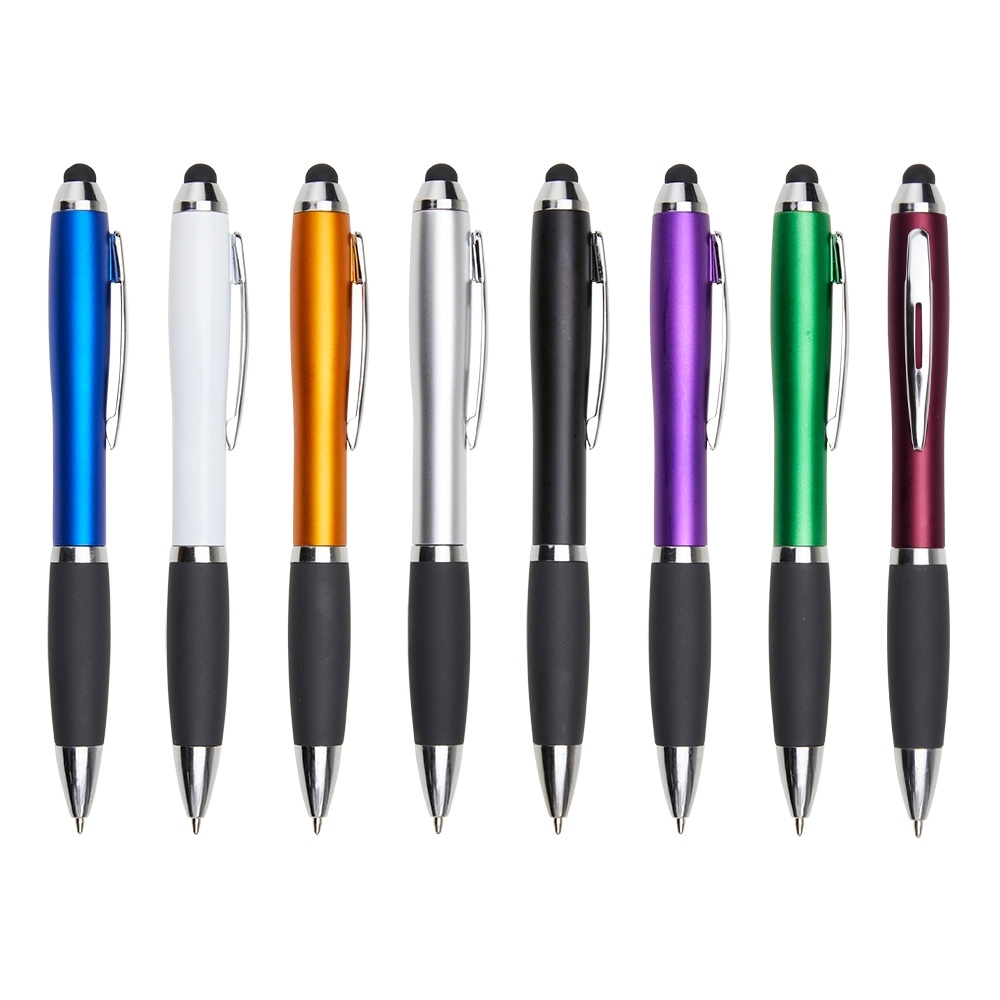 Caneta plástica com touch screen, acionamento por rotação e carga esferográfica azul 1mm.