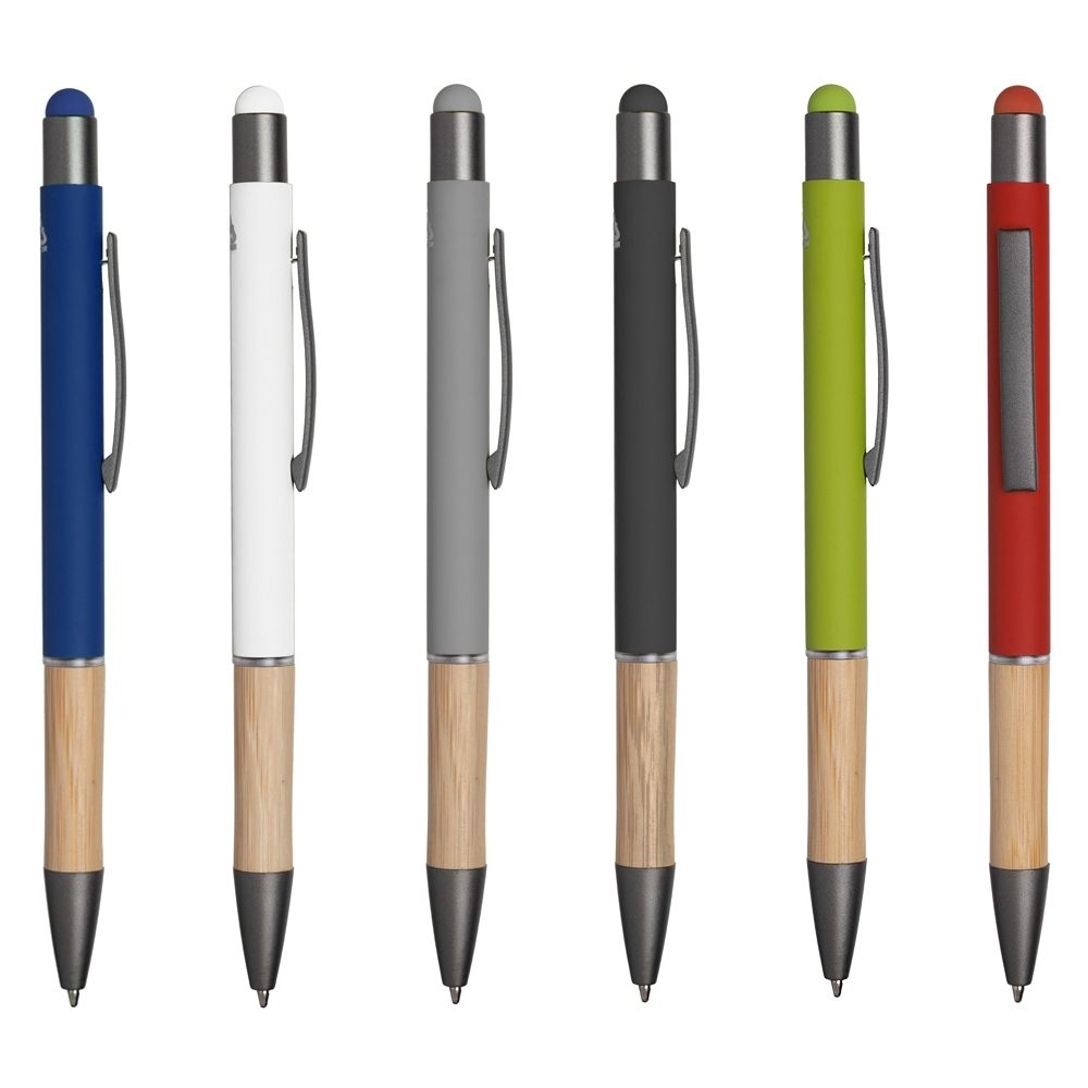 Caneta touch screen em alumínio reciclado com detalhe em bambu e acabamento similar à borracha. Acionamento por clique e carga esferográfica azul 1.0mm.