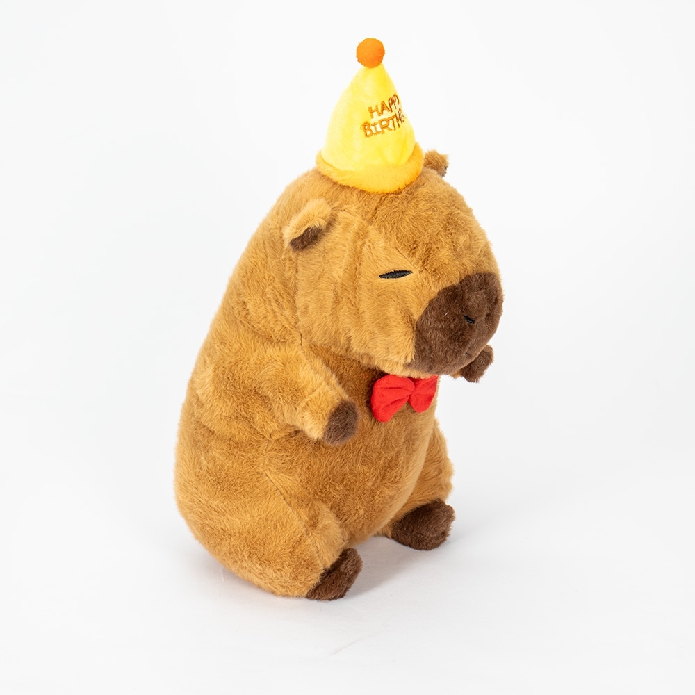 Capivara de pelúcia com textura macia, enchimento em algodão PP e cordão em nylon.