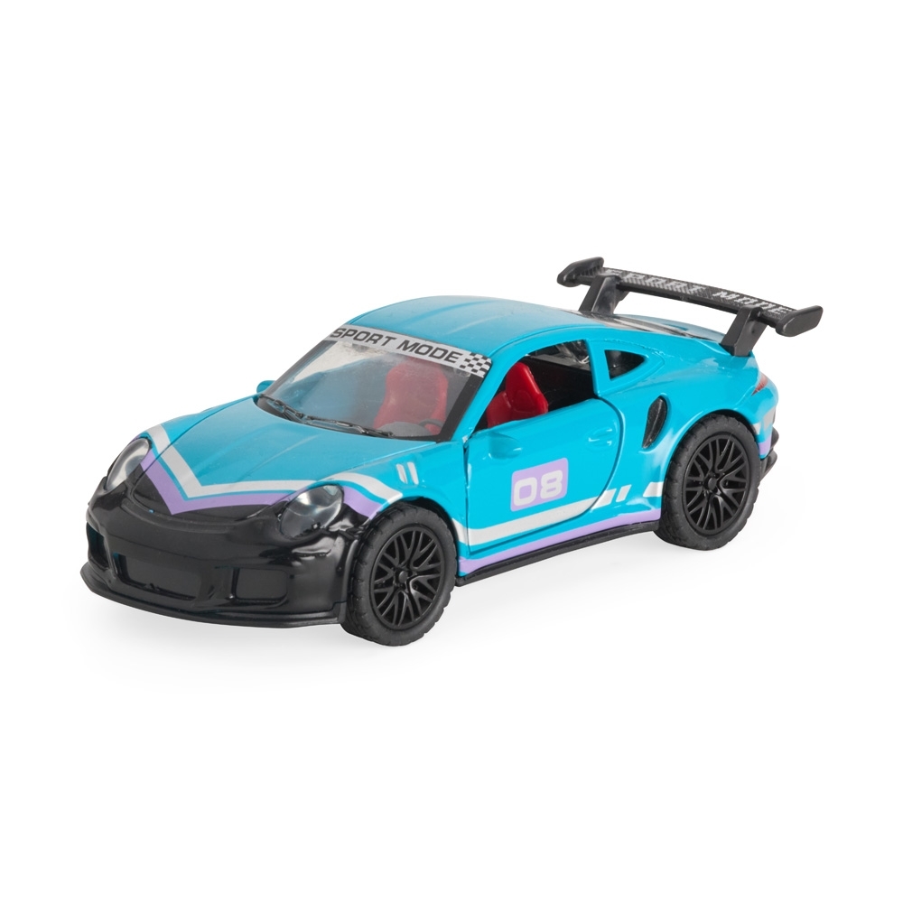 Carro esportivo em miniatura com estrutura em metal e plástico. Possui rodas traseiras com mecanismo de fricção e portas de abertura funcional.