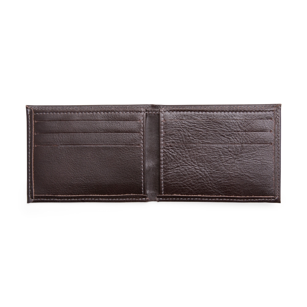 Carteira em couro com design compacto e sem fechamento. Possui seis divisórias internas para cartões e documentos e um compartimento para cédulas.