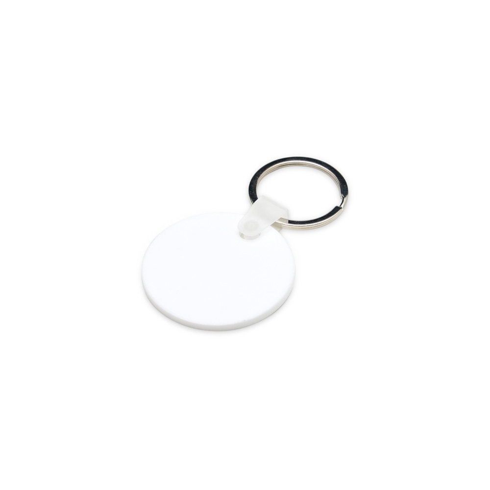 Chaveiro de acrílico em formato redondo, frente verso e liso. Possui prendedor de plástico que conecta a argola metálica.