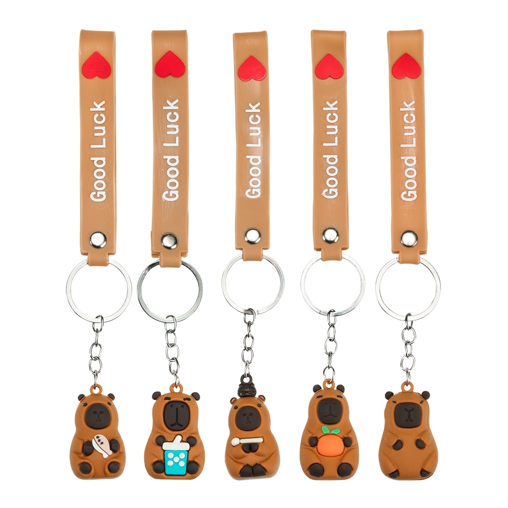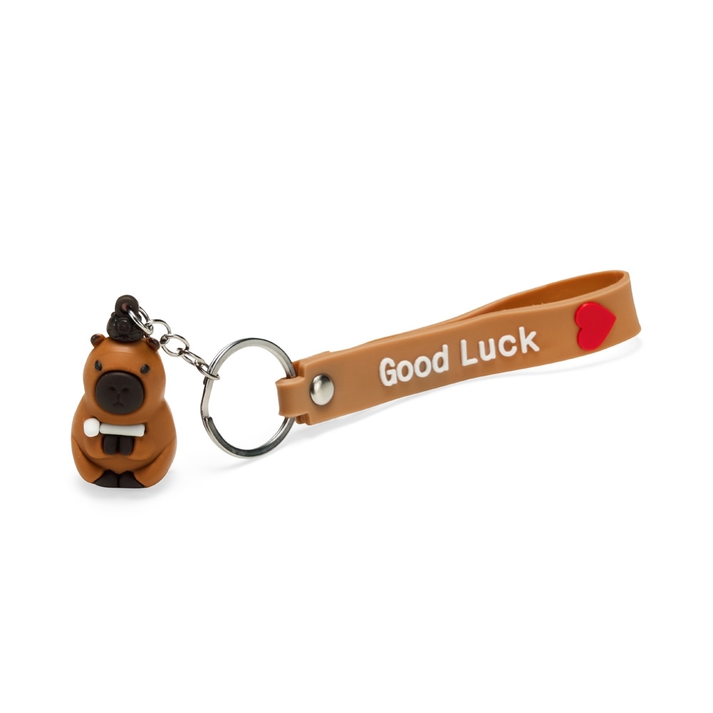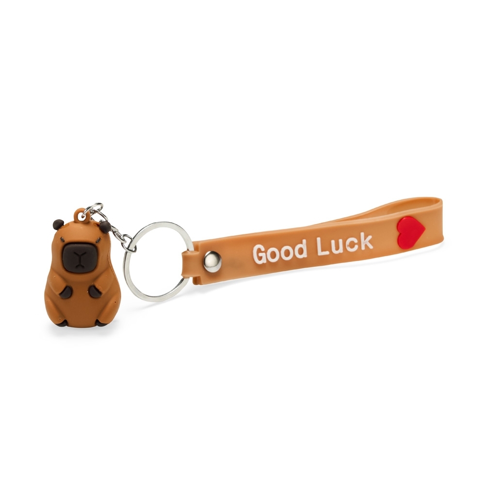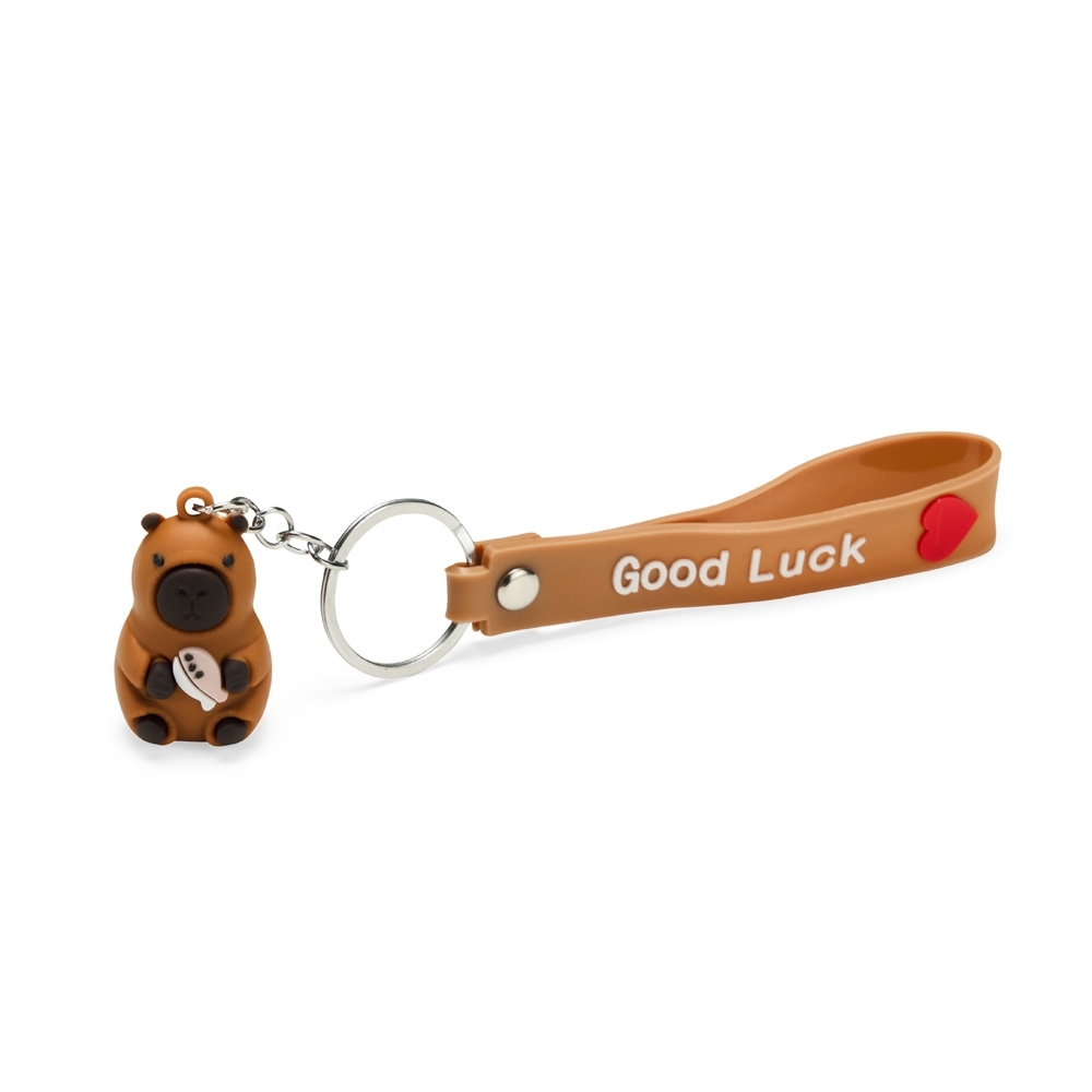 Chaveiro com textura emborrachada e em formato de capivara, acompanhado de argola metálica e correia plástica flexível.