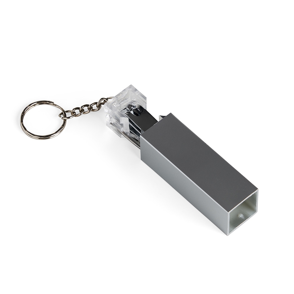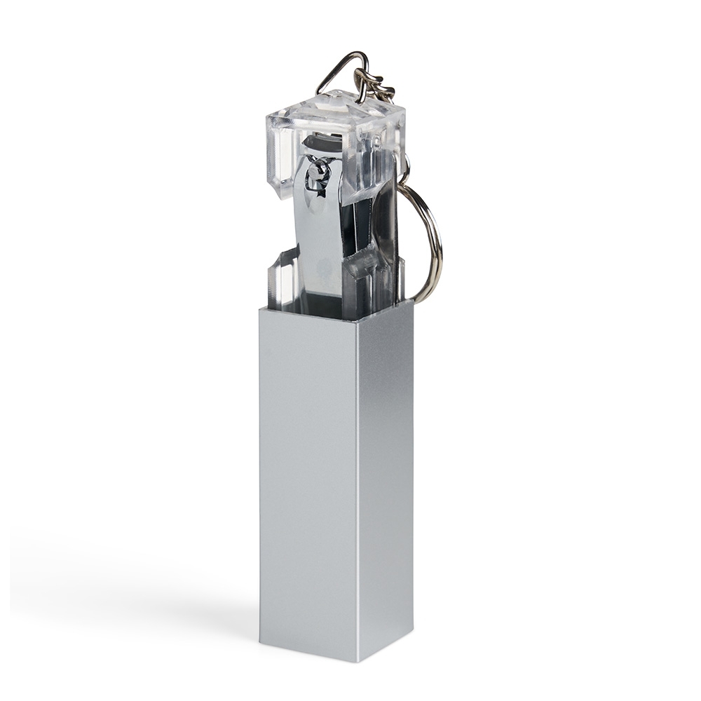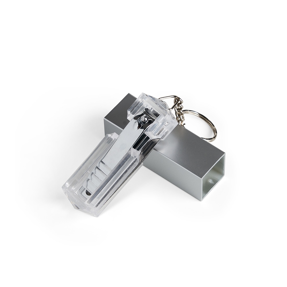 Chaveiro kit manicure 4 peças em estojo plástico. Possui lixa, pinça, empurrador de cutícula e cortador de unha preso. Estojo com berço plástico para acomodação das peças.