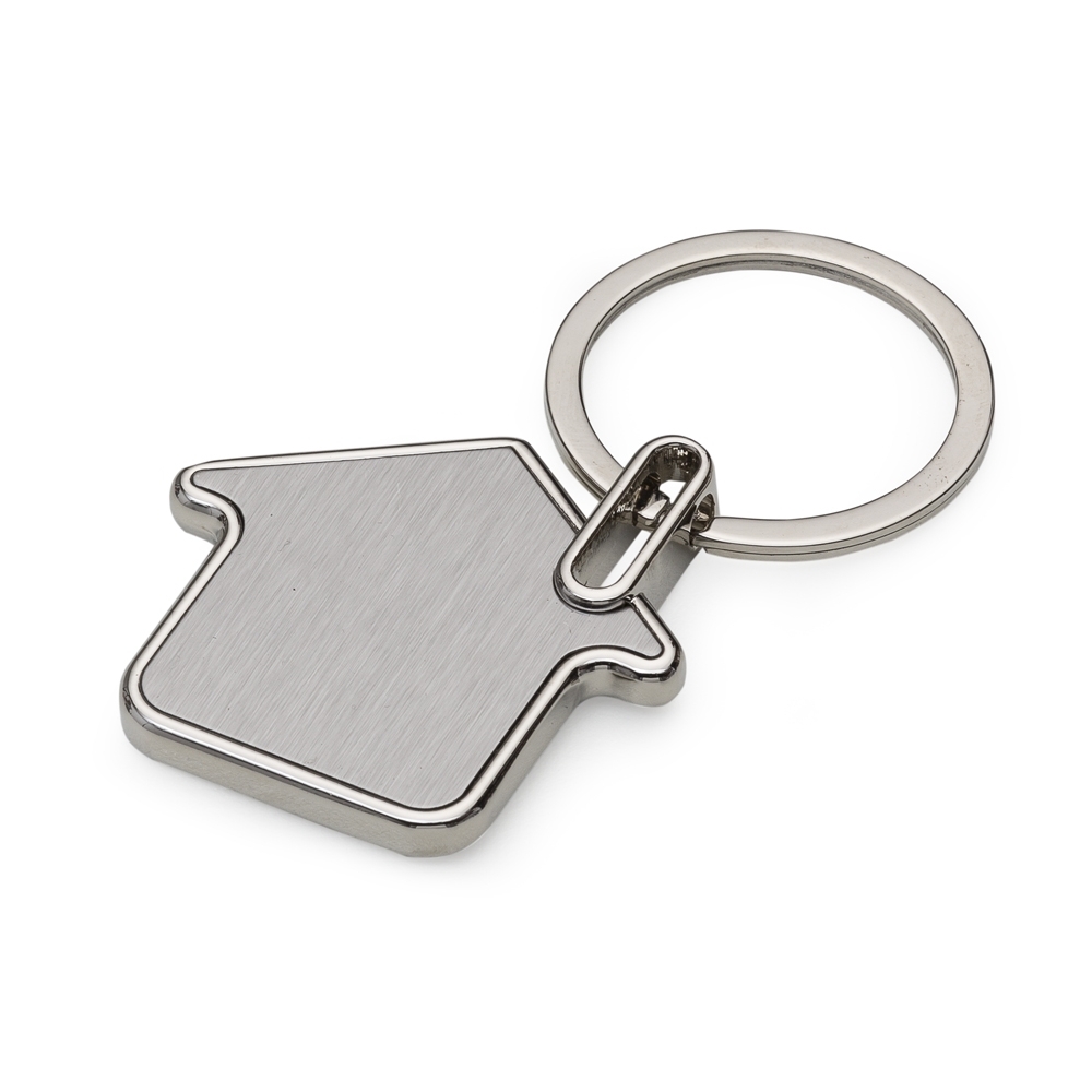 Chaveiro metal formato casa com chapa inox frente e verso lisa.
