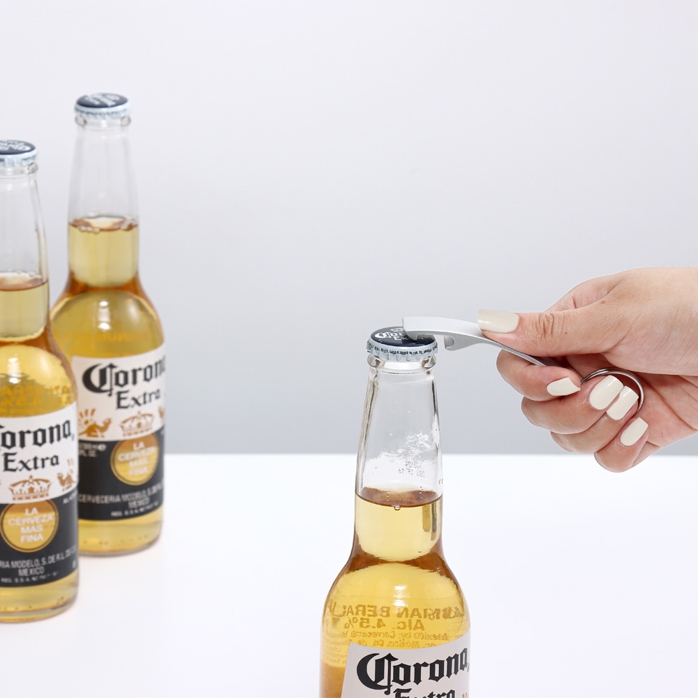 Chaveiro abridor com acabamento fosco, design curvo e argola de ferro niquelado.