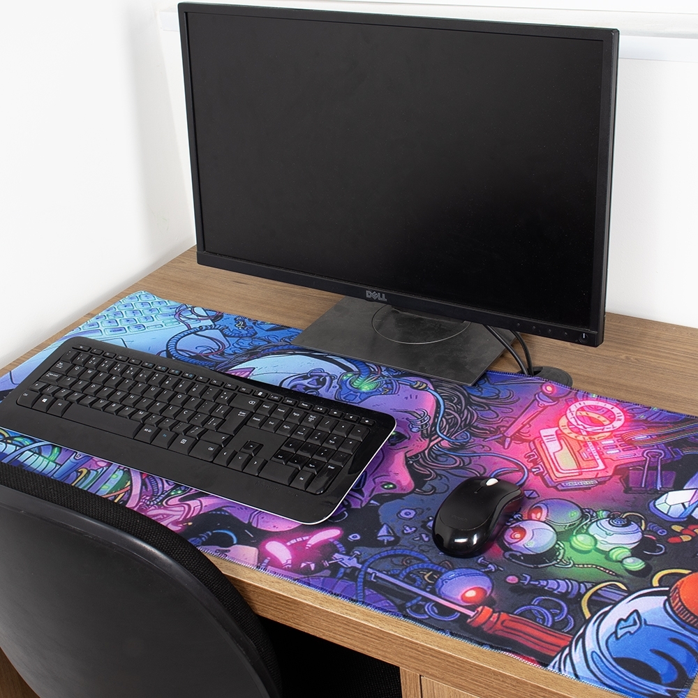 Desk pad flexível confeccionado em poliéster. Apresenta design leve com bordas arredondadas e estampa de estilo futurista. Conta também com base antiderrapante em EVA que ajuda a proteger superfícies contra danos e desgastes.