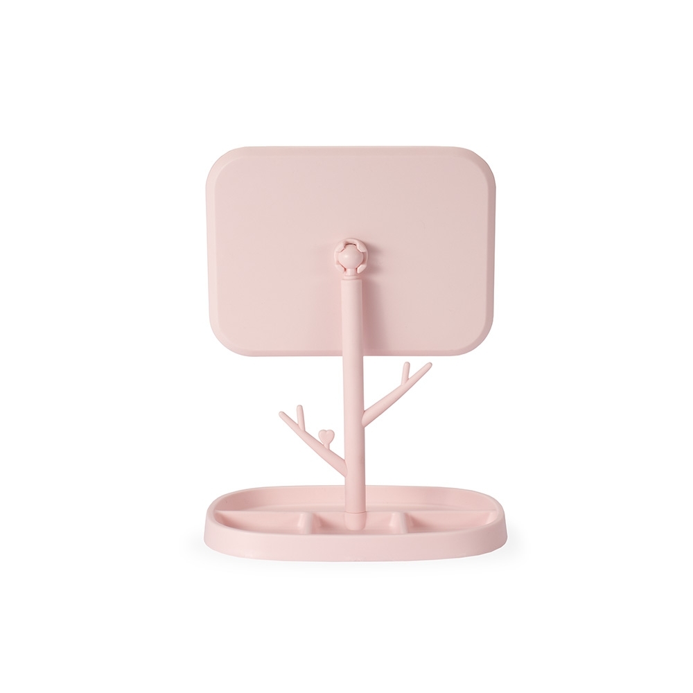 espelho de mesa retangular e estrutura fácil de montar feita em plástico. Conta com pedestal giratório que permite ajustar o espelho em diferentes ângulos e posições. Além disso, possui ganchos laterais e quatro divisórias na base para organizar objetos.