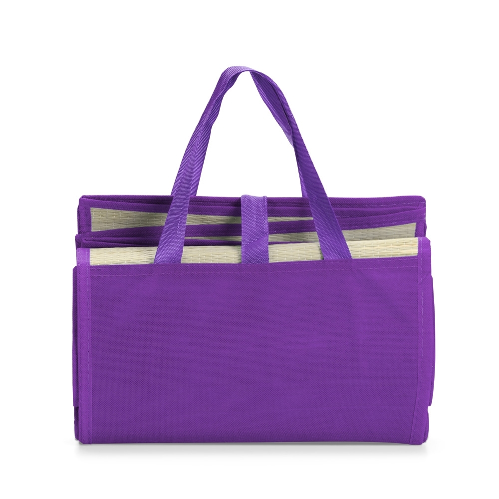Esteira dobrável em palha sintética com bordas costuradas em nylon dividindo a esteira em três partes. Além disso, possui um par de alças costuradas para transporte.