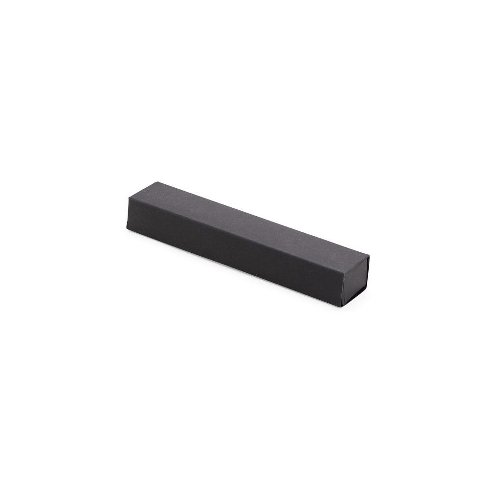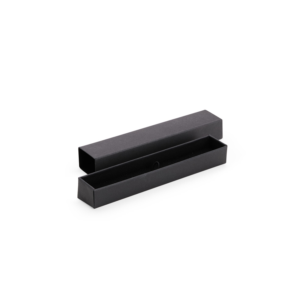 Estojo em papelão com abertura estilo gaveta e berço aveludado e elástico para fixar uma caneta.
