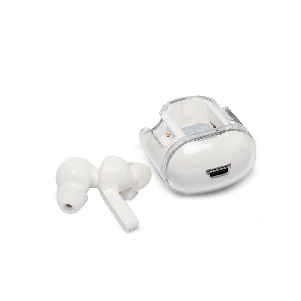 Fone de ouvido Bluetooth TWS com comando touch e case carregador à prova dágua. Possui display de bateria. Material plástico. Acompanha cabo USB Tipo-C.