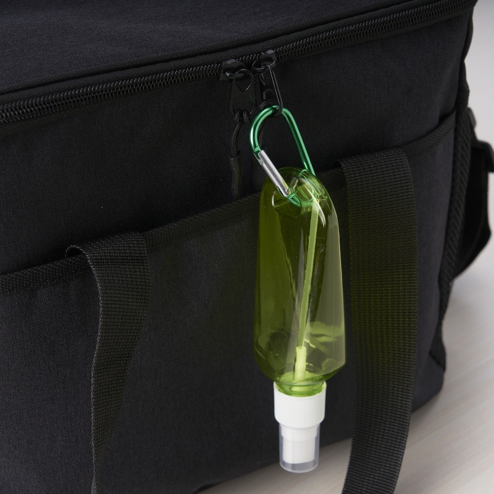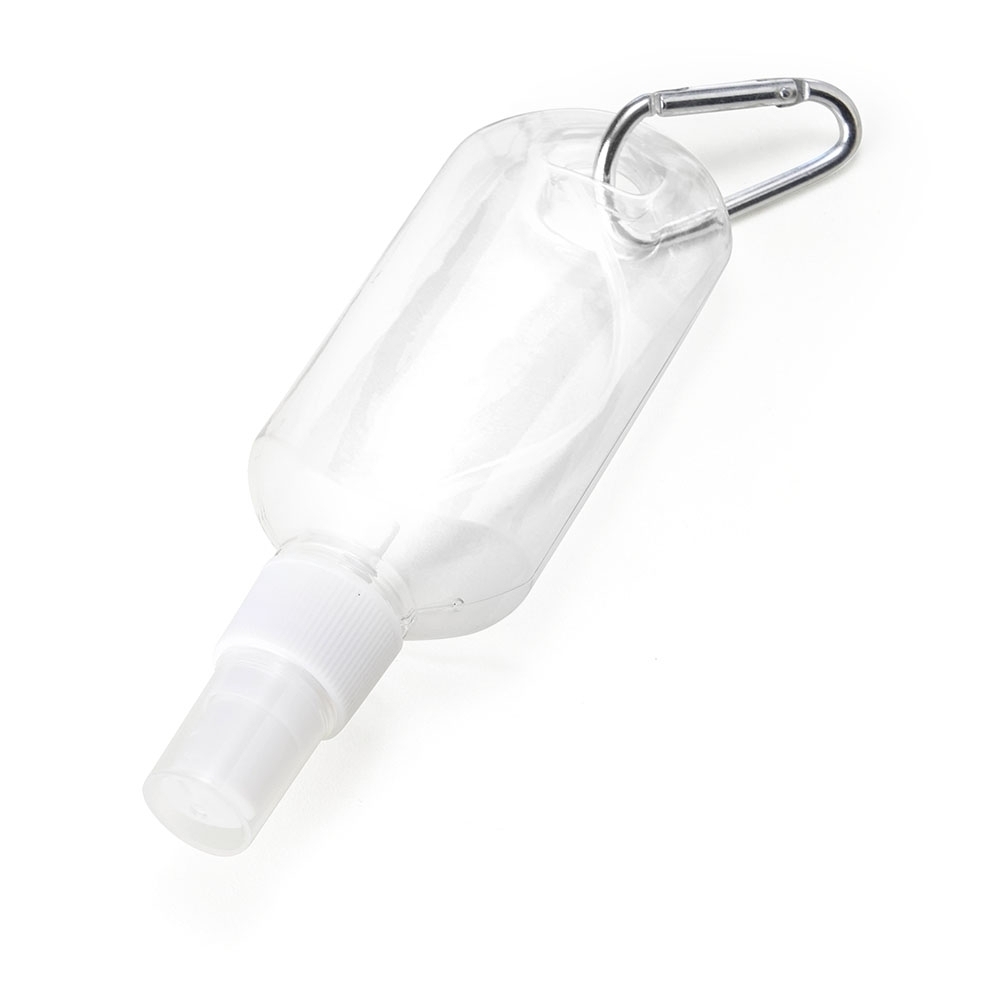 Frasco plástico spray com capacidade de 100ml, contém tampa branca com encaixe rosqueável e acompanha chaveiro mosquetão para transporte.