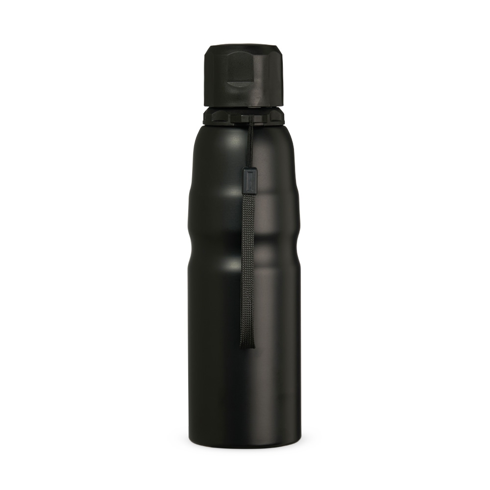 Garrafa inox 800ml com tampa plástica rosqueável e cordão para transporte.