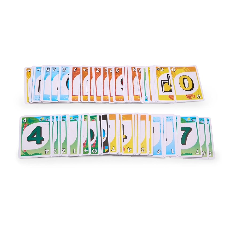 Jogo de cartas Uno com design de verão. Possui 108 cartas, incluindo 19 cartas numéricas e 6 cartas de ação para cada uma das 4 cores do baralho, além de mais 4 cartas especiais: duas cartas de troca de cor e duas cartas para comprar +4. Acompanha folheto de instruções em português brasileiro.