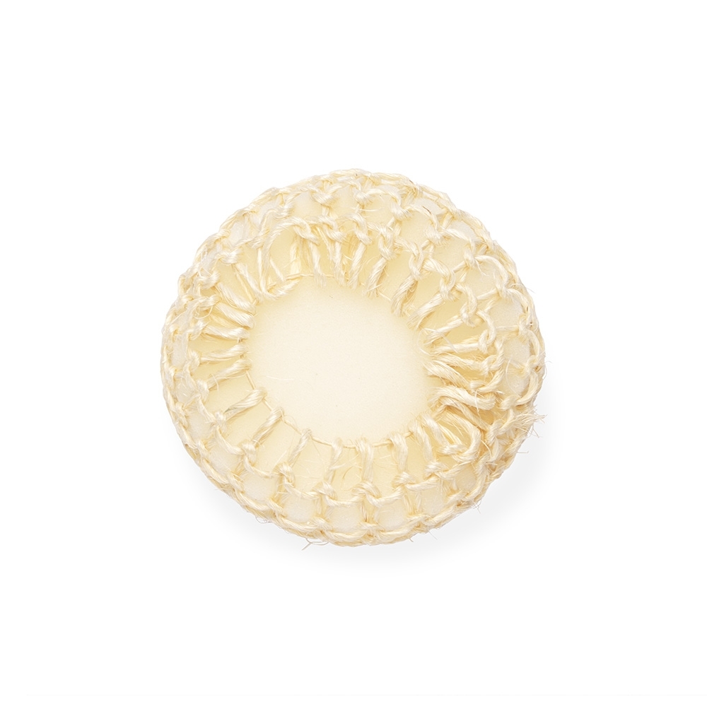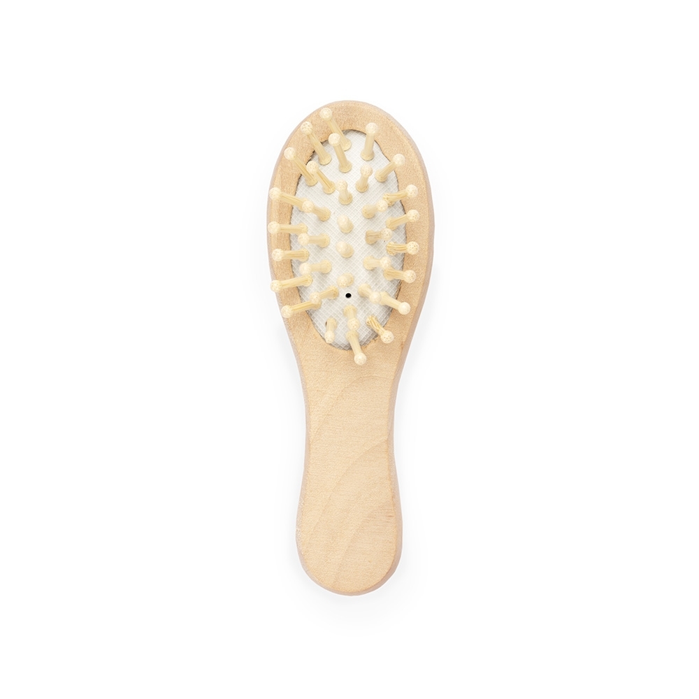 Kit banho com estilo natural envolvido em um cesto de madeira. Contém 4 itens: escova de madeira com cerdas macias, pedra-pomes, esponja redonda e uma esponja de nylon.