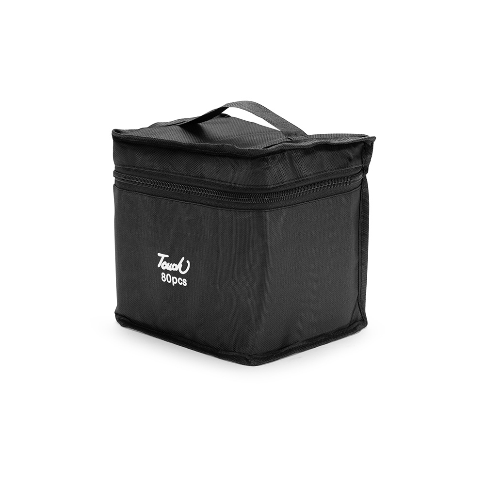 Kit com 80 canetas marcadoras feitas em plástico com pontas duplas: uma fina e outra chanfrada. Acompanham bolsa com alça e fechamento em zíper para transporte.