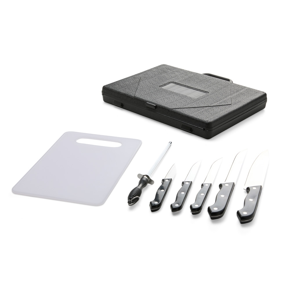 Um kit completo para ajudar na preparação de um churrasco inteiro e deixar o momento de confraternização ainda melhor. Este conjunto traz 7 itens, incluindo 1 tábua em plástico, 1 chaira em aço inox, e 5 facas em tamanhos diferentes do mesmo material: 1 faca de legumes (com 3 polegadas de lâmina), 1 faca de cozinha (com lâmina de 4 polegadas), 1 faca de desossar (com lâmina de 5 polegadas), 1 faca trinchante (com lâmina de 7 polegadas) e 1 faca peixeira (com lâmina de 8 polegadas). Tudo isso acompanhada por uma elegante maleta para facilitar a organização e o transporte do kit.